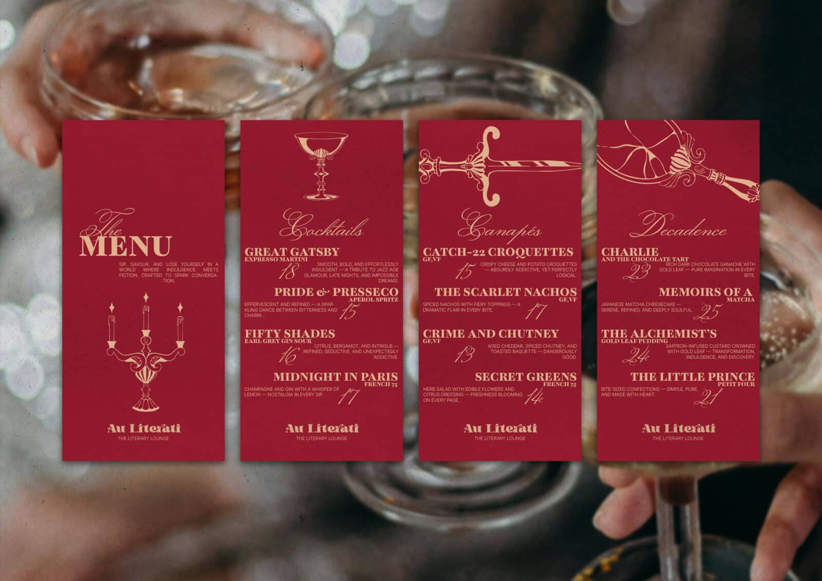 The reasoning behind the design of the menu and hand drawn illustrations was intended to reflect Au Literati’s bold, romantic and chic brand identity inspired by staple gothic literature iconographies such as – The Chalice, Candelabra, Decorative Dagger, Hand Mirror and Antique Key. I used repeated motifs of ornate and organic shapes that resembles the femininity of ‘Corinth Columns’ to pay homage to the Greek philosophy school of thought and to my earlier conceptualisation of Au Literati.
