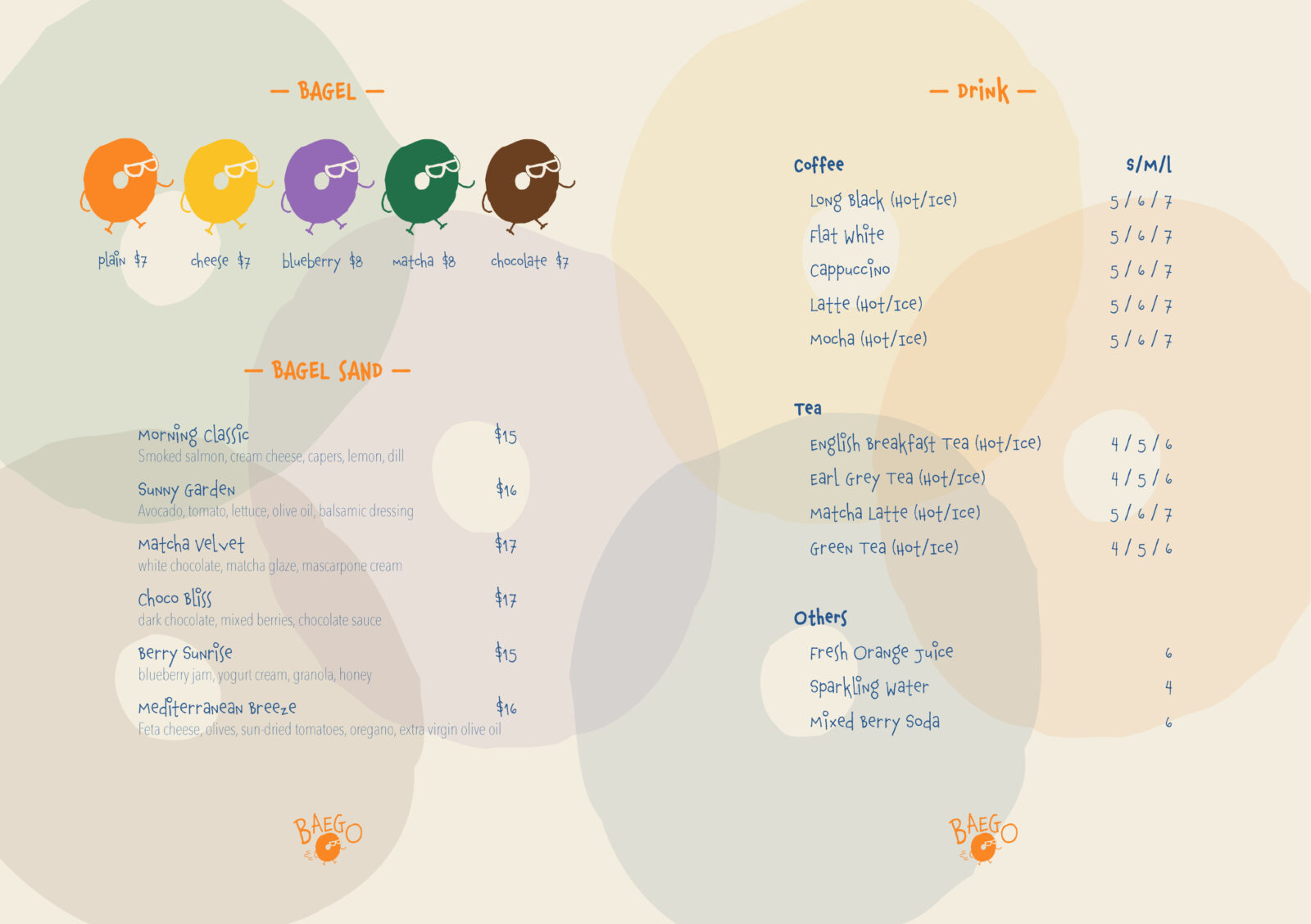 "BAEGO" is a brand created to bring warmth, joy, and convenience to everyday life through delicious bagels. Beyond food, the brand aims to create a cheerful space where customers can feel comforted and connected — leaving the shop with both a satisfied appetite and a brighter mood.