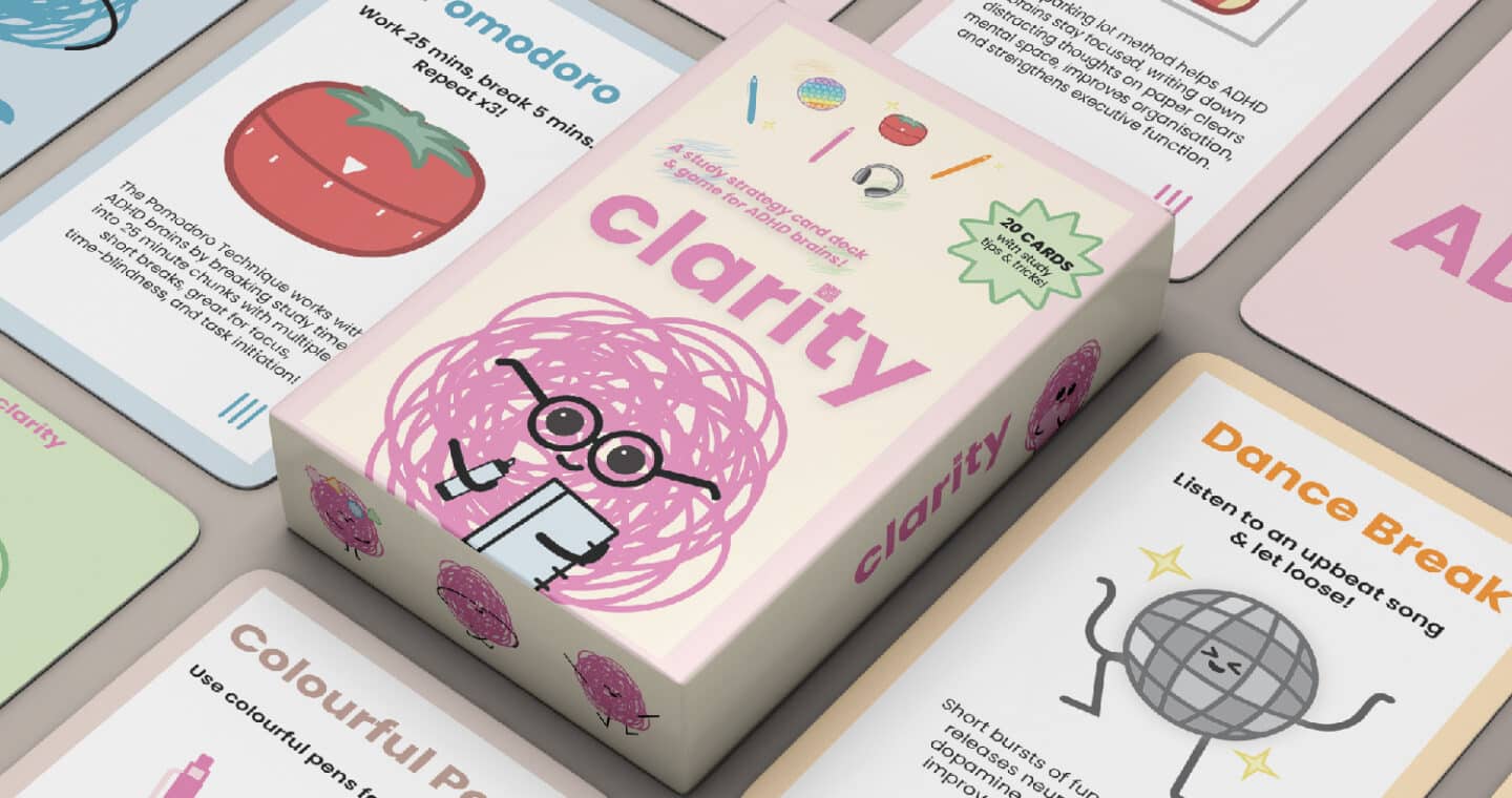 Clarity is a study support card deck and game designed for high school and university students with ADHD. Divided into five categories, it provides practical strategies that complement ADHD learning styles. Through structure, organisation, and gamified rewards, Clarity encourages focus and motivation, making studying a more engaging experience.