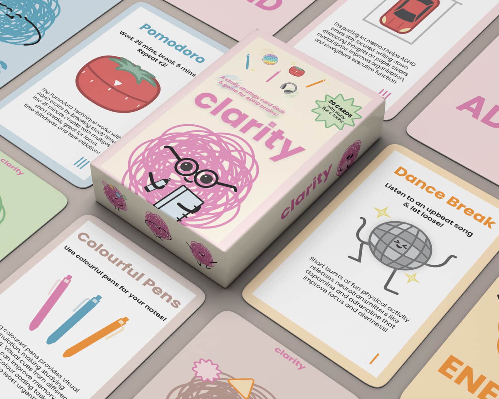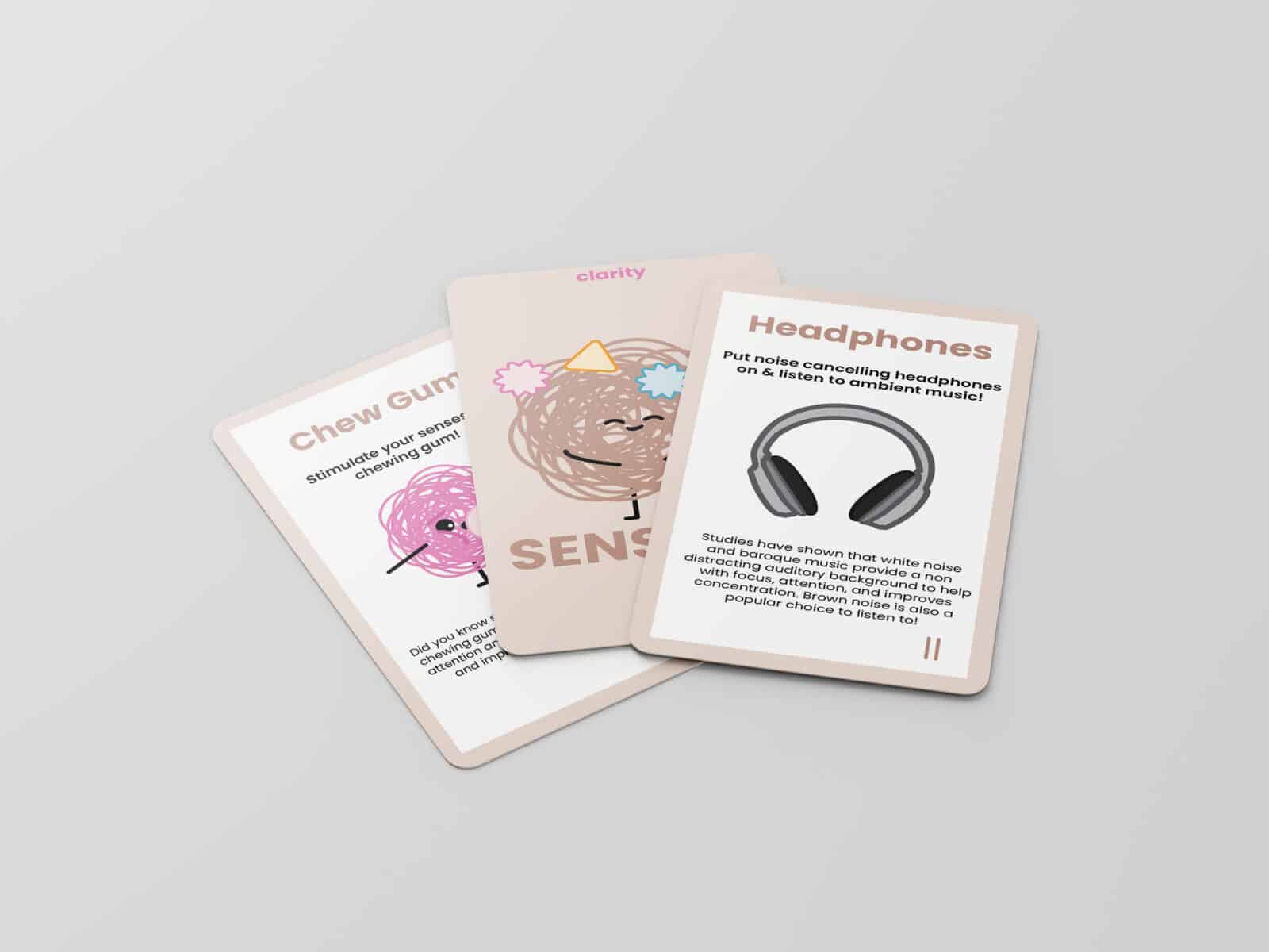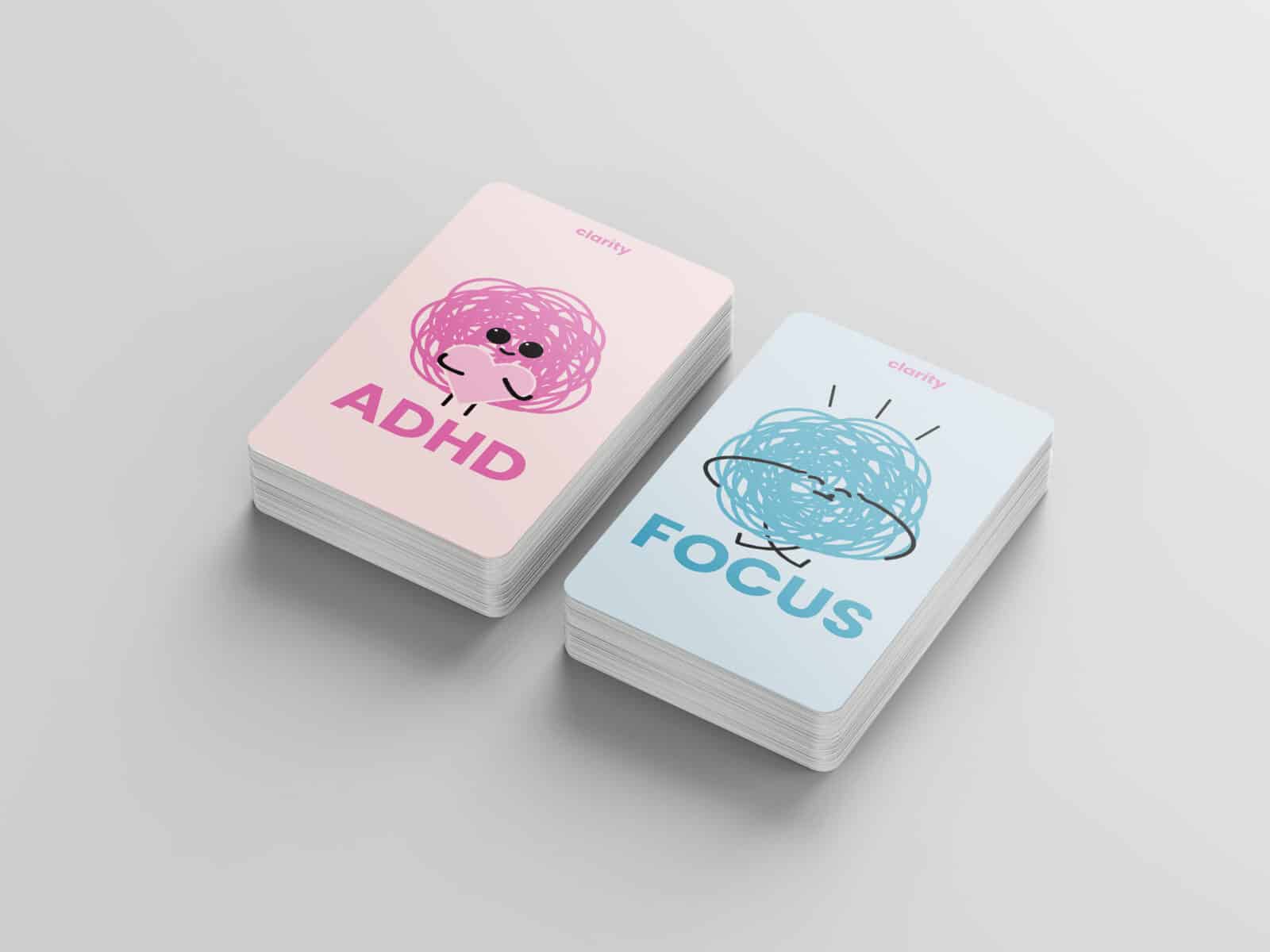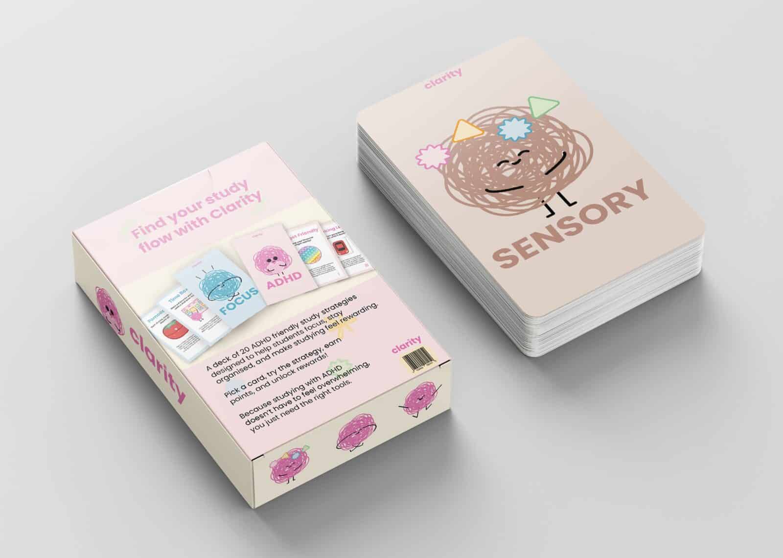 Clarity is a study support card deck and game designed for high school and university students with ADHD. Divided into five categories, it provides practical strategies that complement ADHD learning styles. Through structure, organisation, and gamified rewards, Clarity encourages focus and motivation, making studying a more engaging experience.
