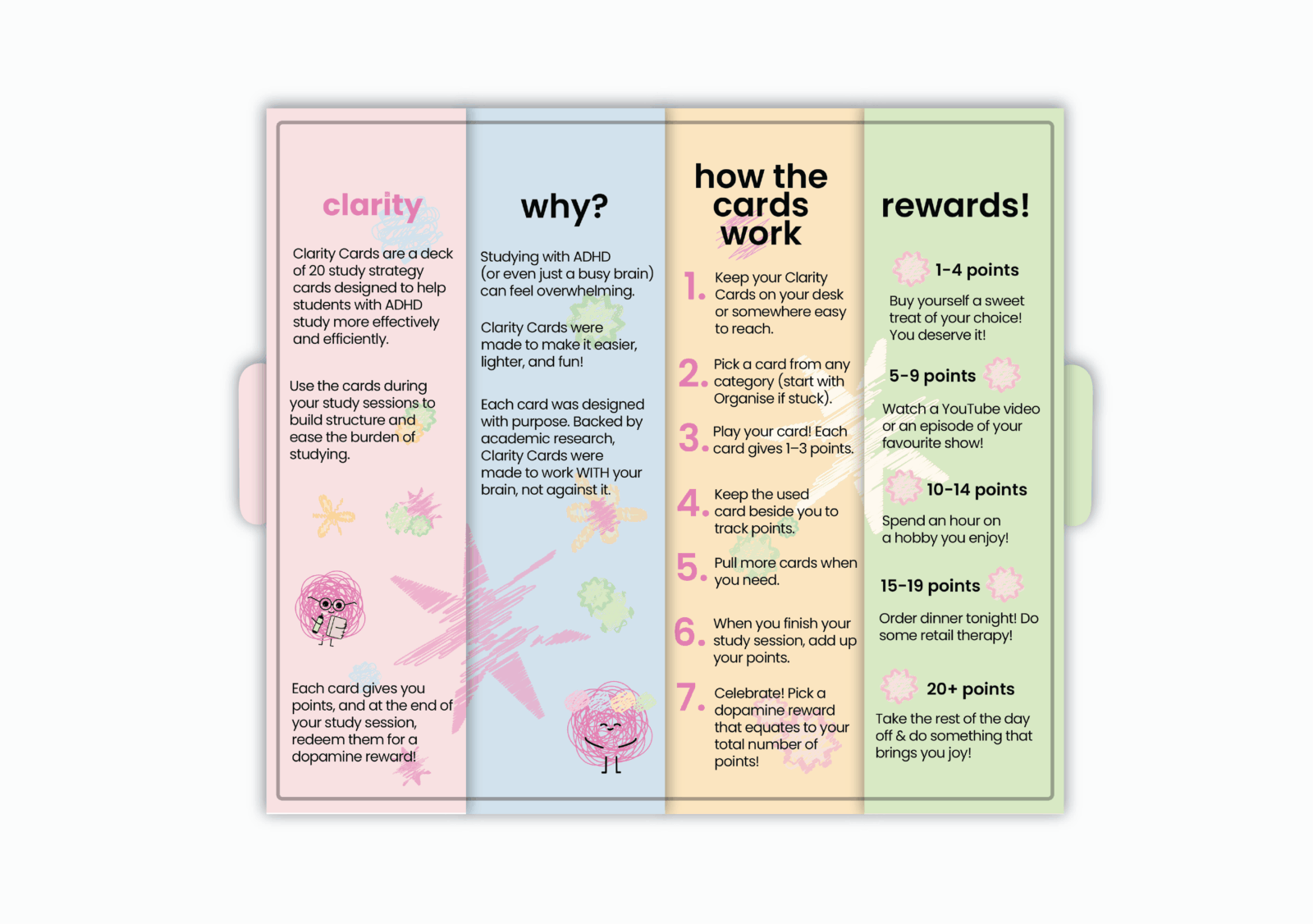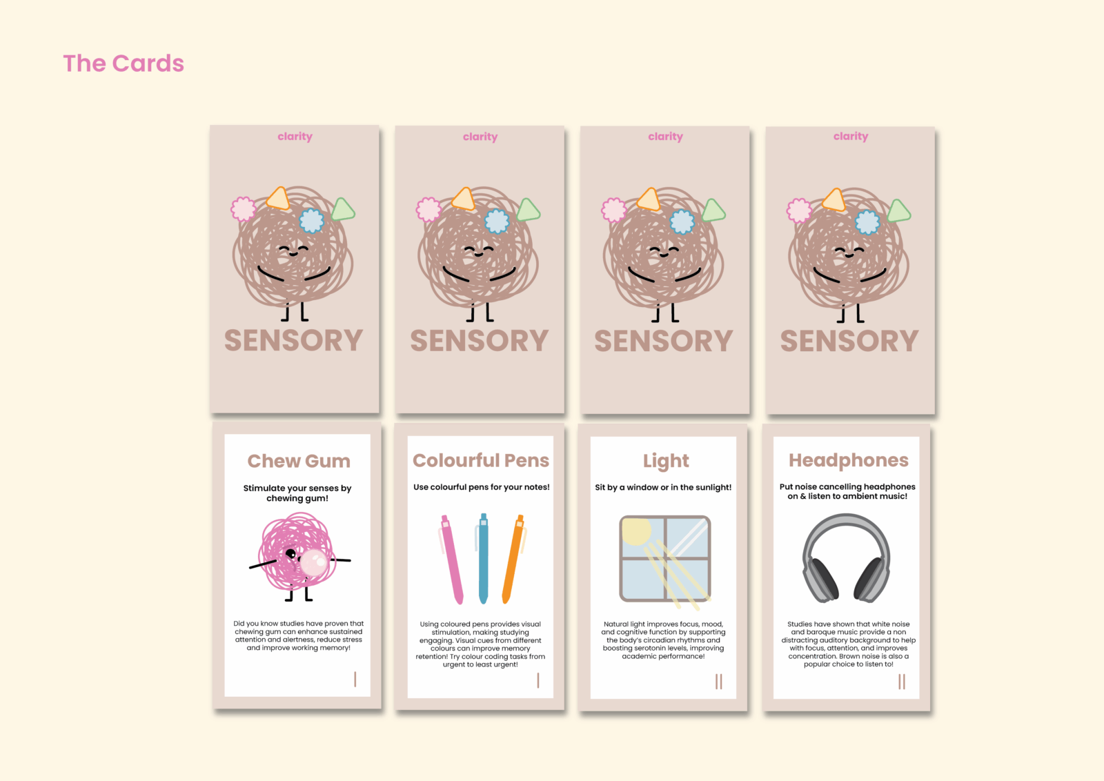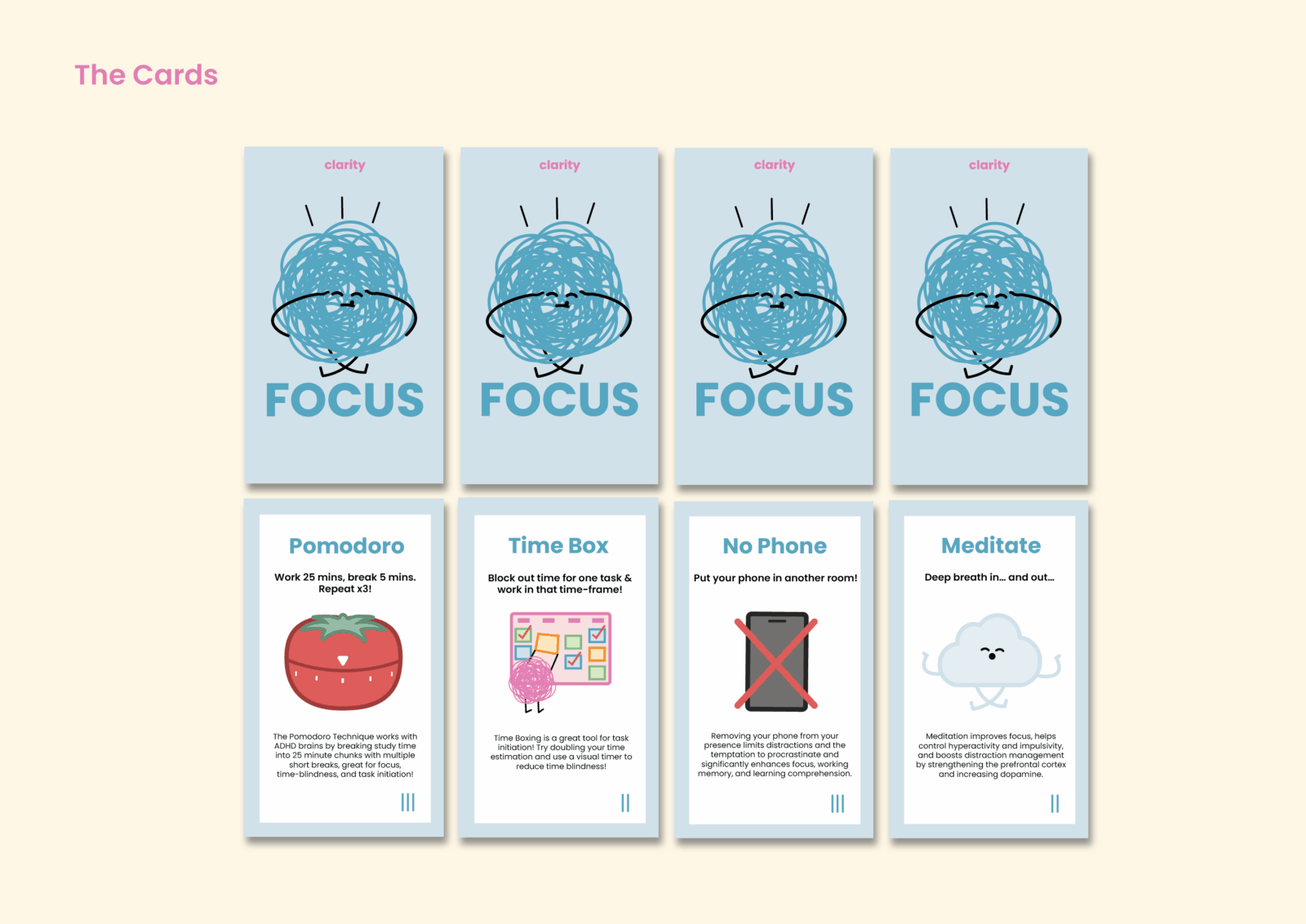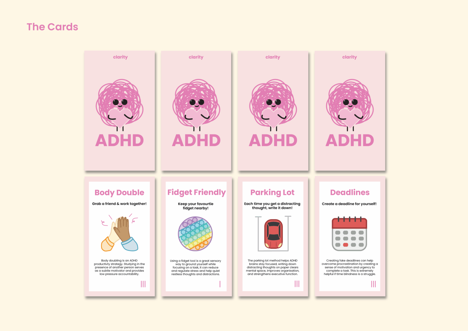 Clarity is a study support card deck and game designed for high school and university students with ADHD. Divided into five categories, it provides practical strategies that complement ADHD learning styles. Through structure, organisation, and gamified rewards, Clarity encourages focus and motivation, making studying a more engaging experience.