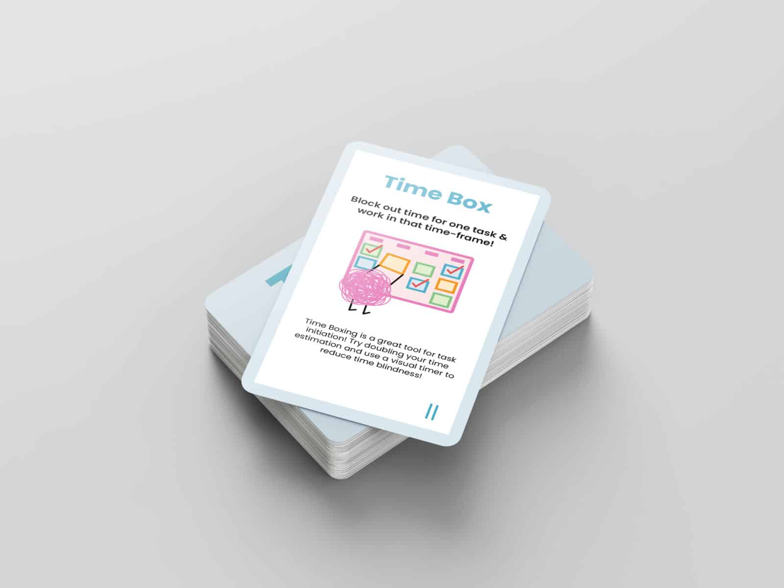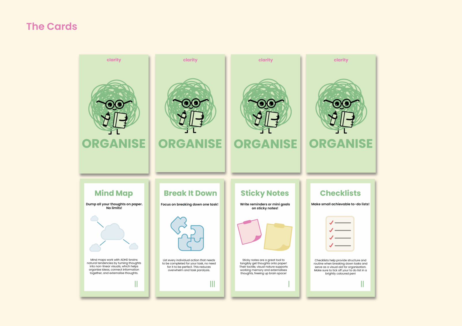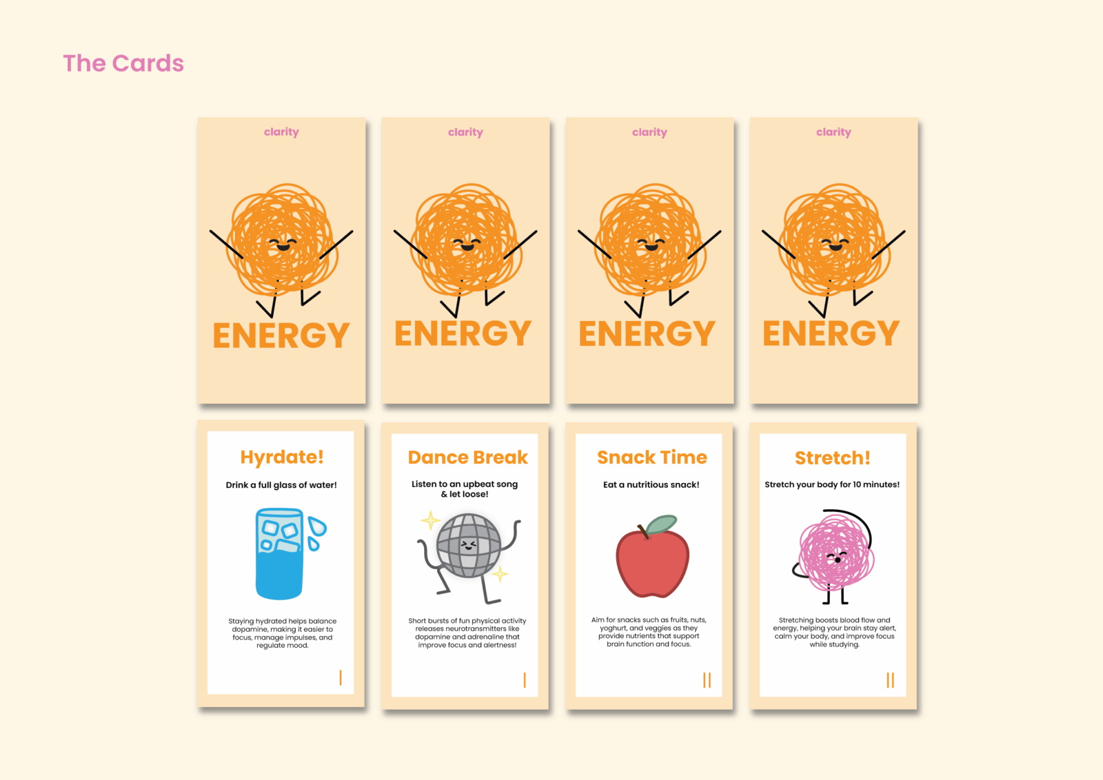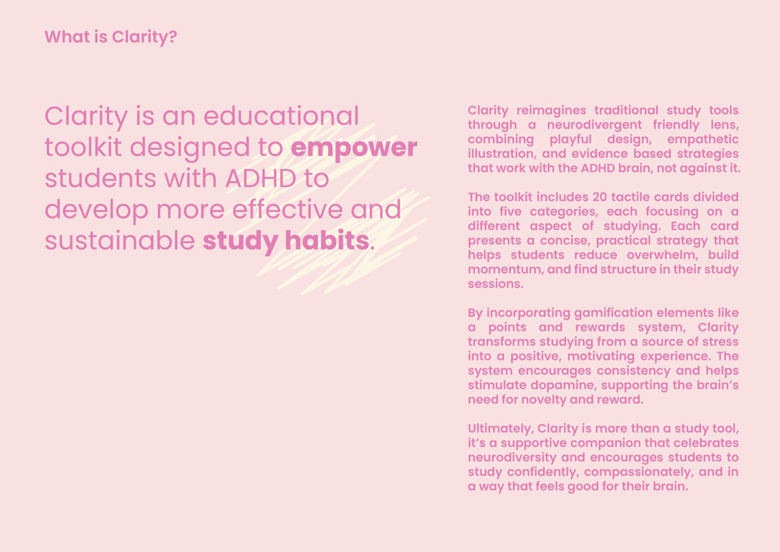 Clarity is a study support card deck and game designed for high school and university students with ADHD. Divided into five categories, it provides practical strategies that complement ADHD learning styles. Through structure, organisation, and gamified rewards, Clarity encourages focus and motivation, making studying a more engaging experience.
