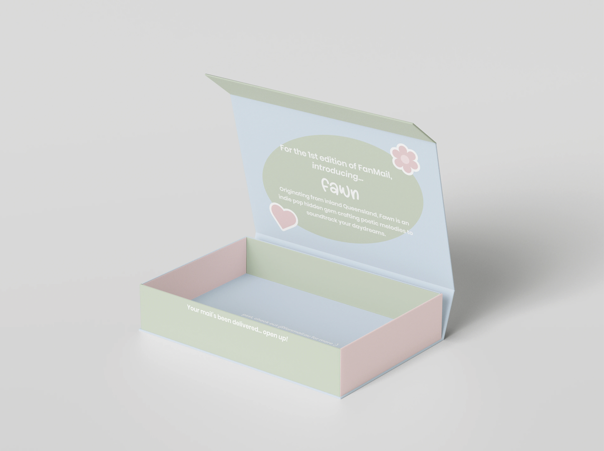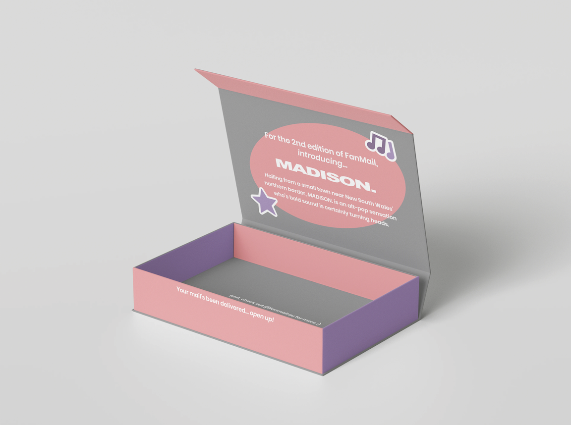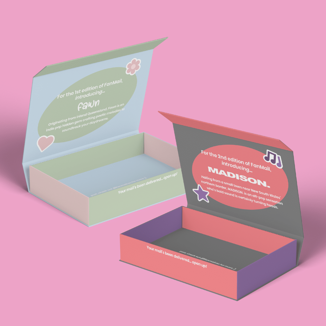 FanMail aims to connect dedicated fangirls to up-and-coming local pop artists through collectable 'MailBoxes' and social media content - increasing accessibility to the Australian music industry. Each edition is curated by a surprise pop artist and full of themed goodies to connect fans to them and their music. You don't know who it'll be or what's inside until it's delivered!