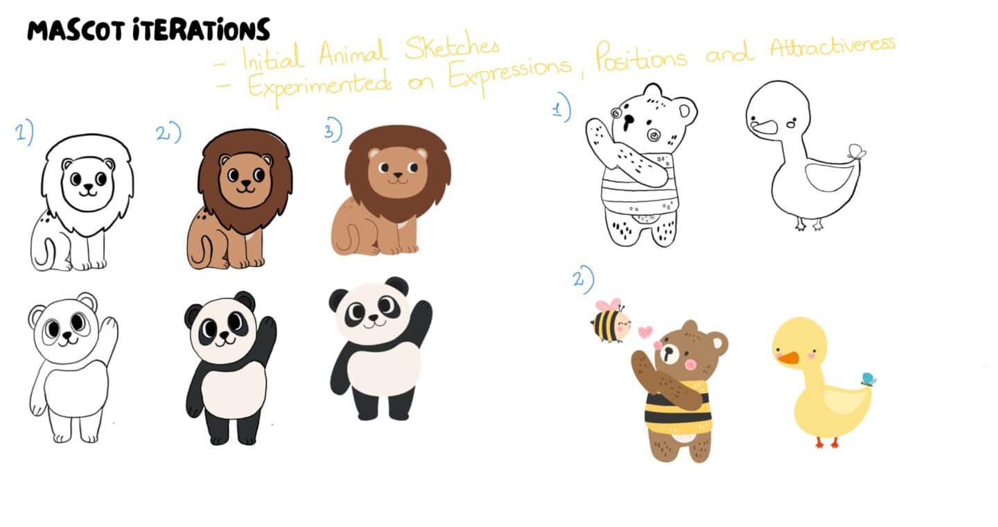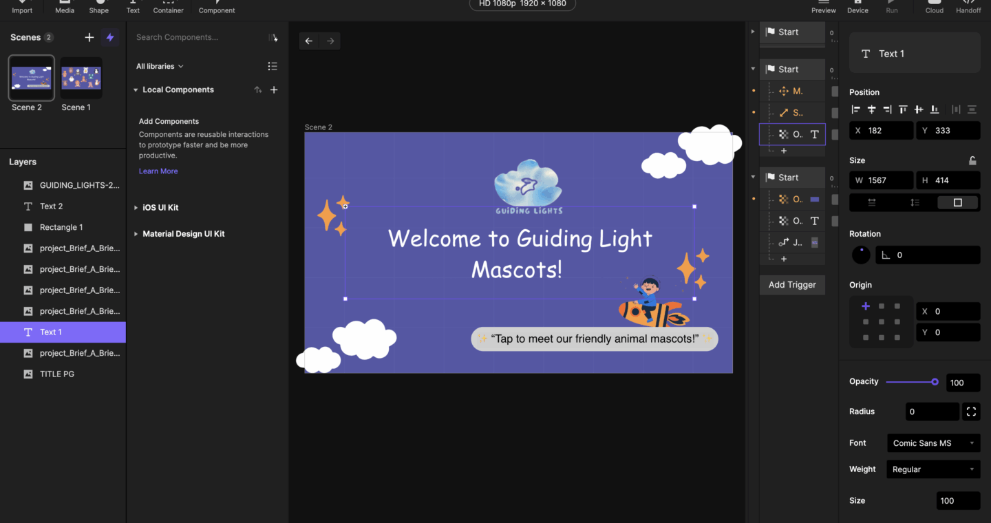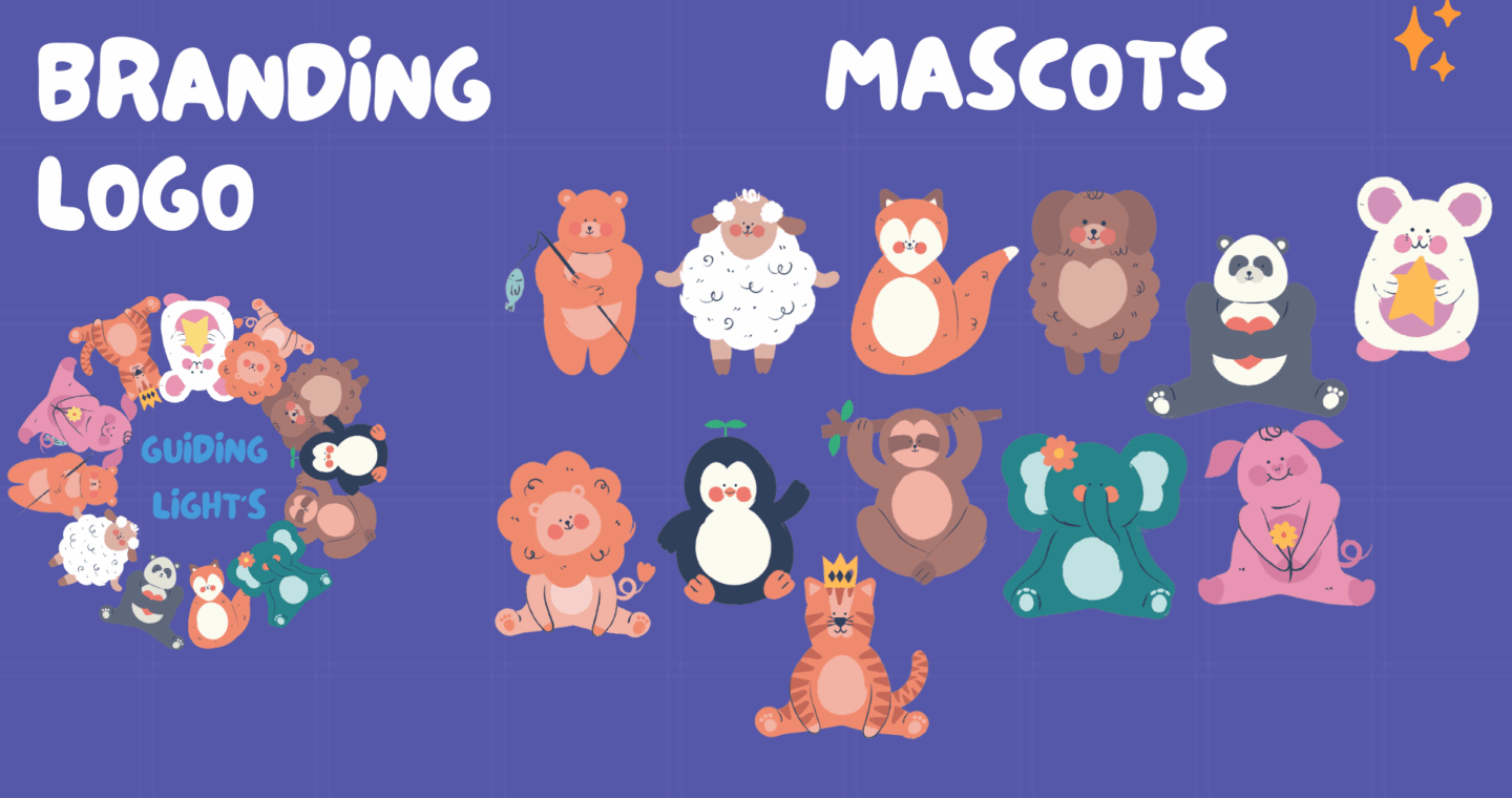 The project focuses on children’s emotional learning through digital design. Using hand-illustrated mascots, sound effects, and interaction triggers in ProtoPie, Guiding Lights brings affirmations to life. The process involved creating characters, composing sounds, and designing intuitive transitions to make learning feel joyful and meaningful.