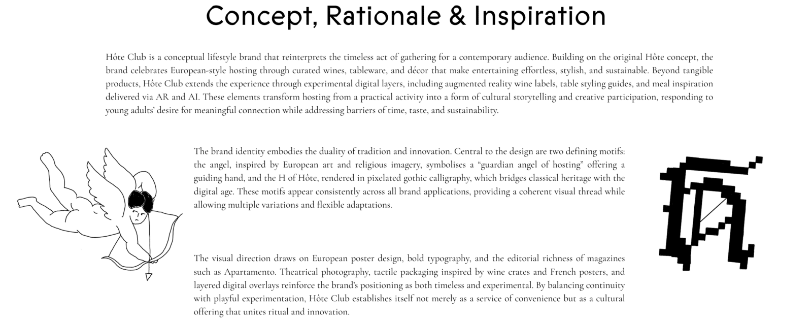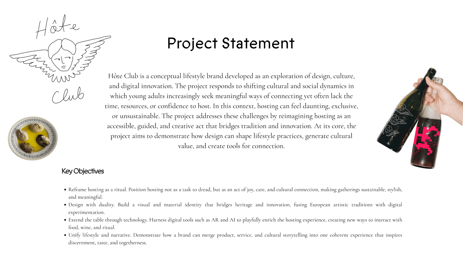 Hôte Club is a conceptual lifestyle brand and subscription box that reimagines the art of gathering for a contemporary audience. Designed for people with busy lives, it blends European heritage with digital innovation to make hosting effortless, stylish, and sustainable. Hôte Club transforms everyday gatherings into meaningful acts of creativity and connection.