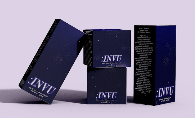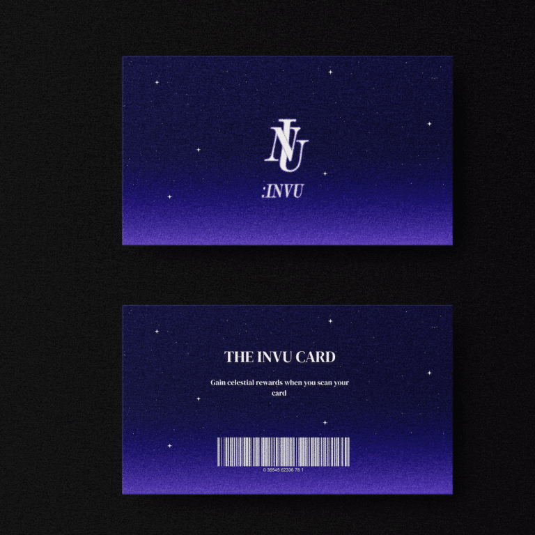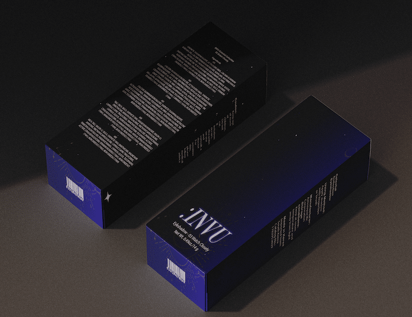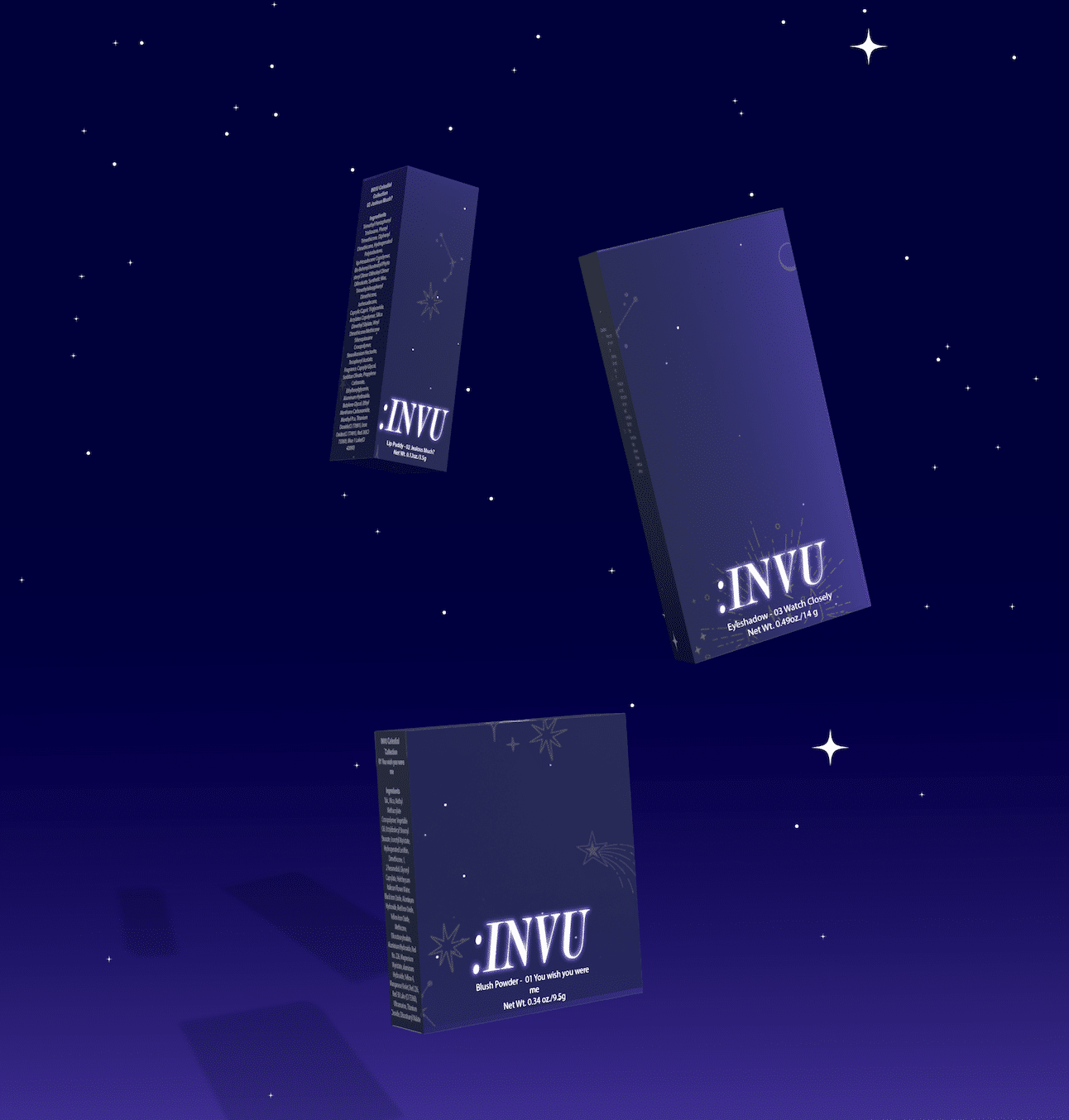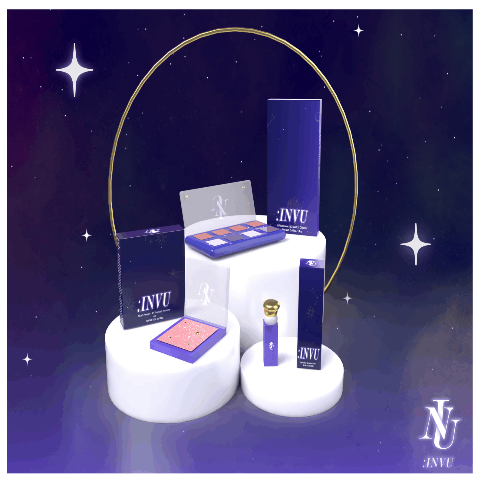 INVU’s overall design was inspired by a makeup look discovered during research, with one model’s celestial-inspired makeup standing out from the rest. The gold, sparkles, and star-like details captured a sense of individuality and mystery that became the foundation of the brand’s aesthetic pathway. Alongside this, the refined and luxurious packaging of Clé de Peau Beauté served as an additional source of inspiration, demonstrating how design can communicate while allowing room for creative storytelling. This balance between elegance and celestial boldness shaped INVU’s unique brand identity.