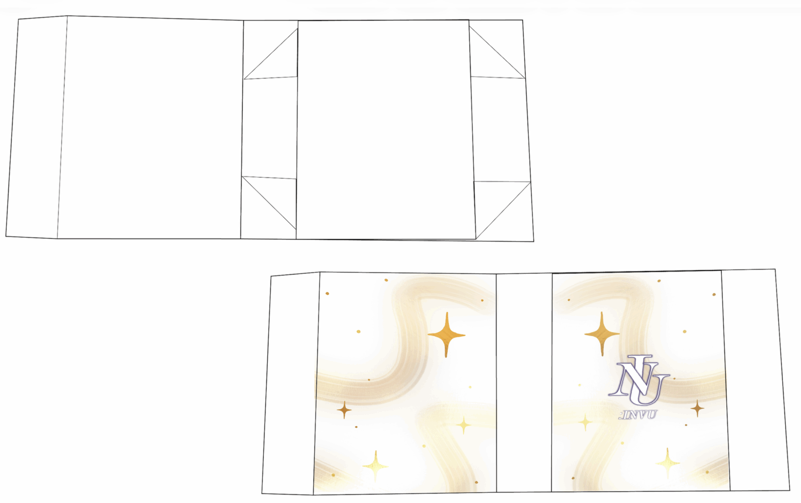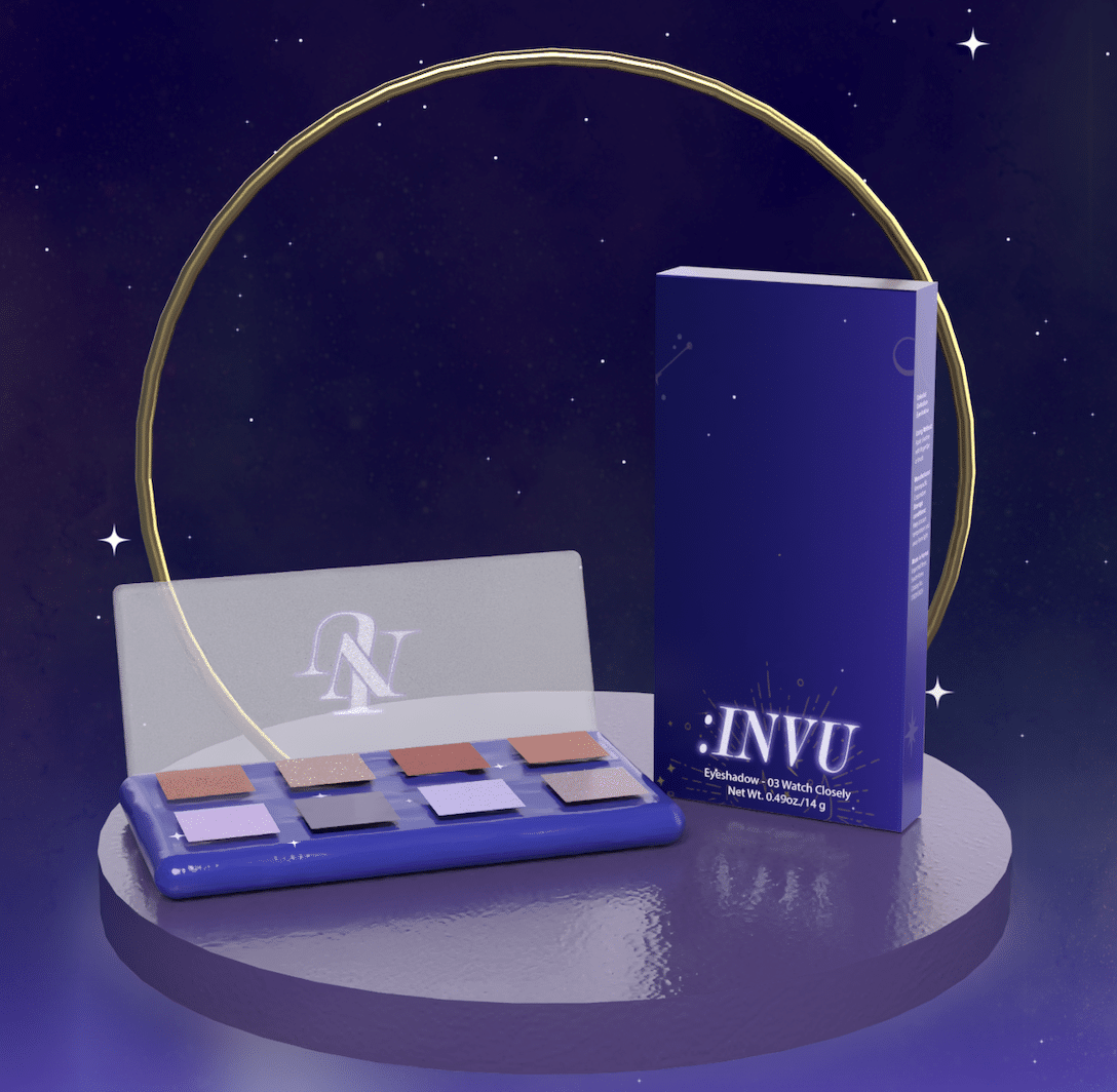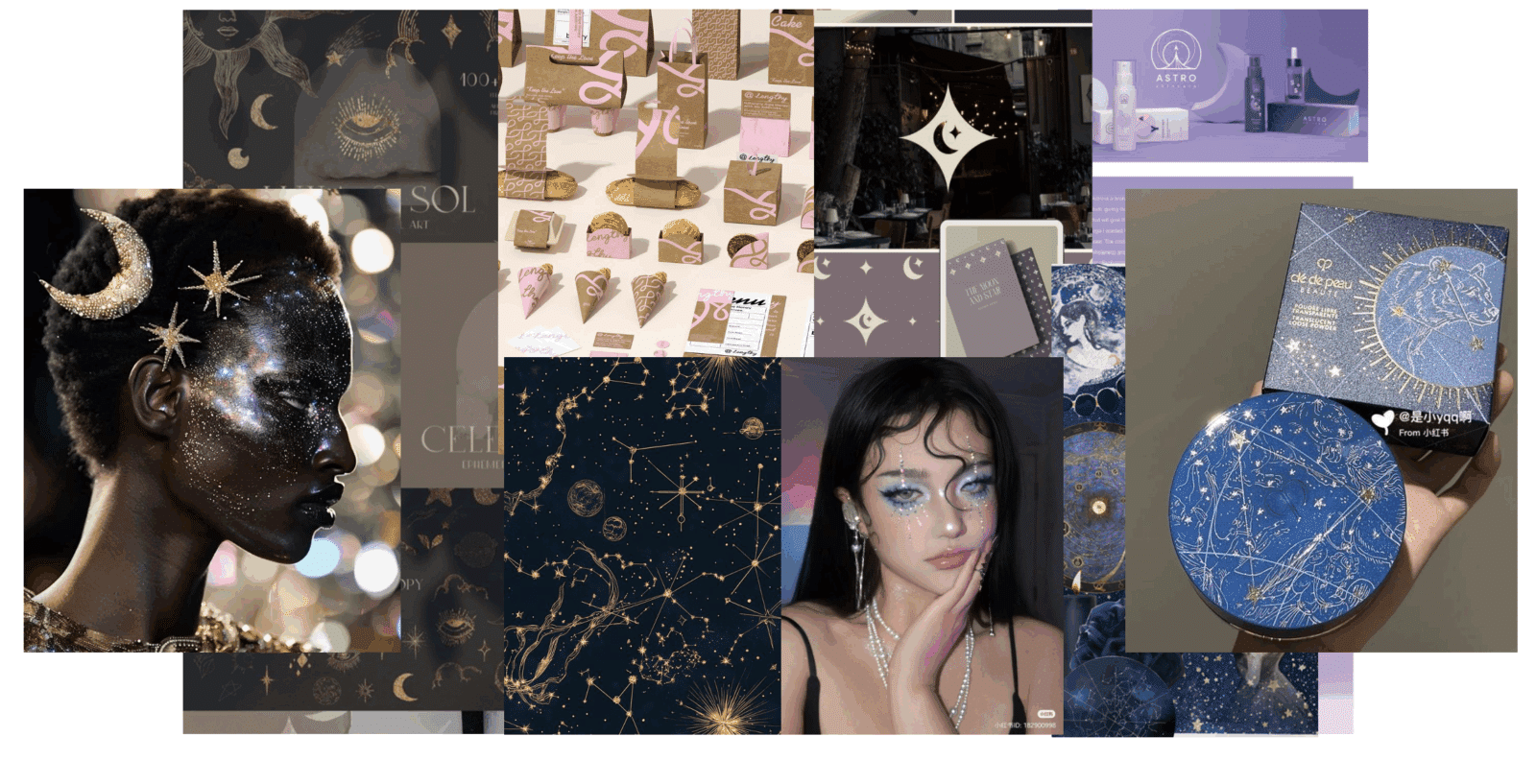 INVU’s overall design was inspired by a makeup look discovered during research, with one model’s celestial-inspired makeup standing out from the rest. The gold, sparkles, and star-like details captured a sense of individuality and mystery that became the foundation of the brand’s aesthetic pathway. Alongside this, the refined and luxurious packaging of Clé de Peau Beauté served as an additional source of inspiration, demonstrating how design can communicate while allowing room for creative storytelling. This balance between elegance and celestial boldness shaped INVU’s unique brand identity.