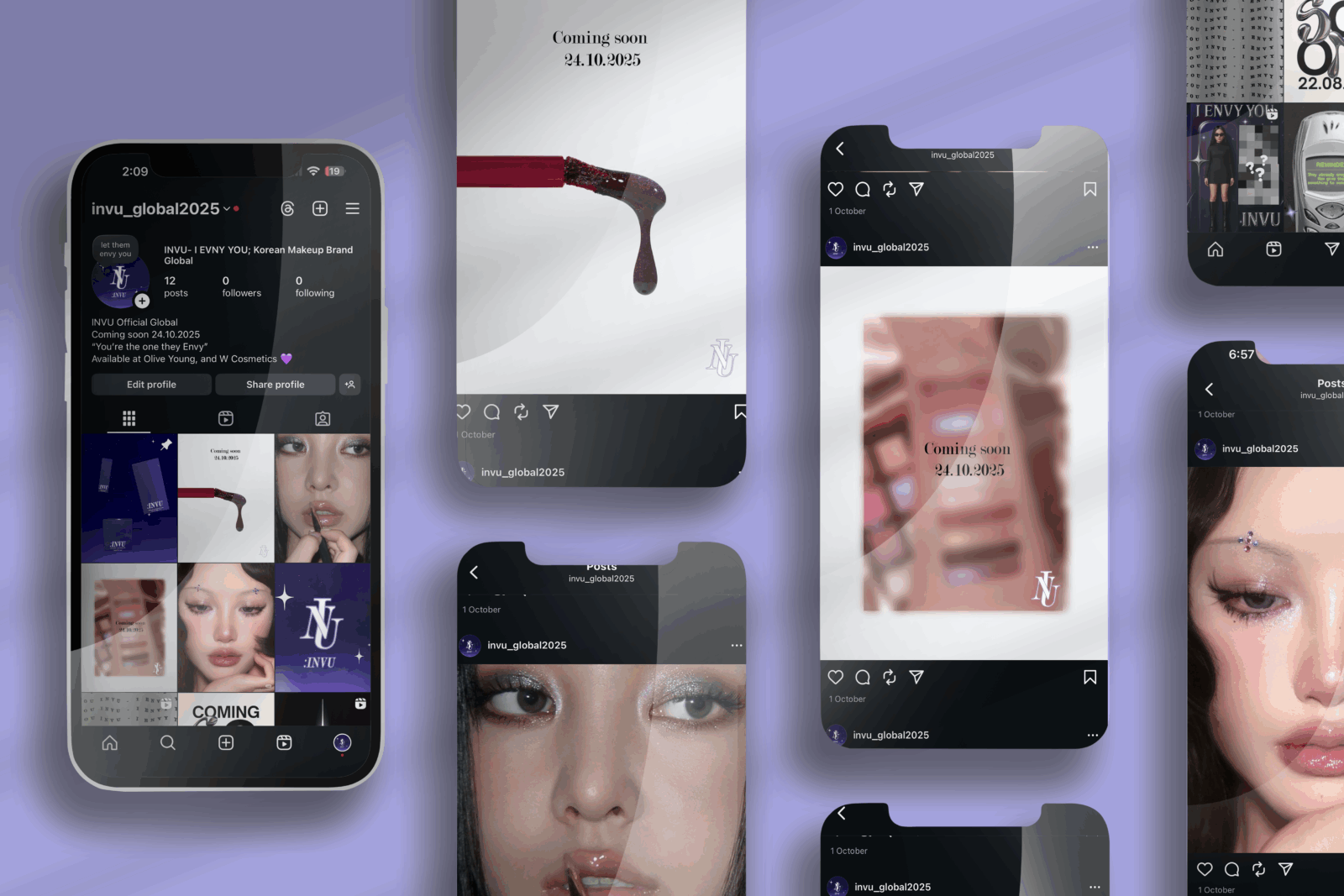 INVU – I Envy You is a Korean-inspired makeup brand empowering individuality through bold, sophisticated design. Created for visually expressive Gen Z–Millennial women, INVU rejects the overused pastel aesthetic, embracing a confident, modern look that inspires self-expression and authenticity in a market dominated by visual sameness.