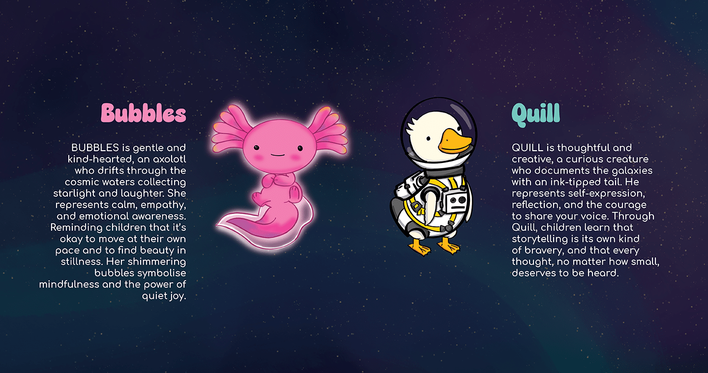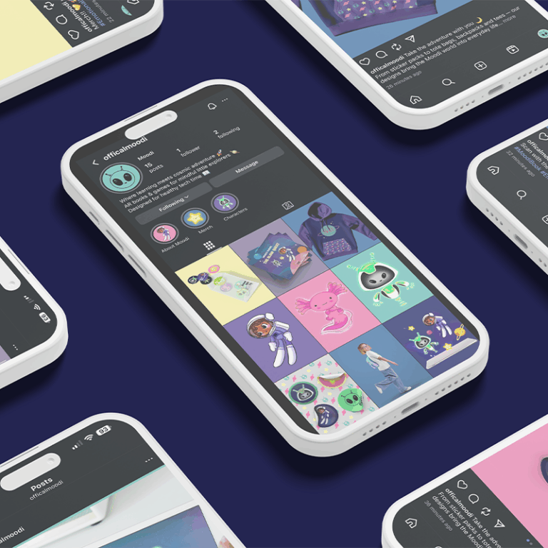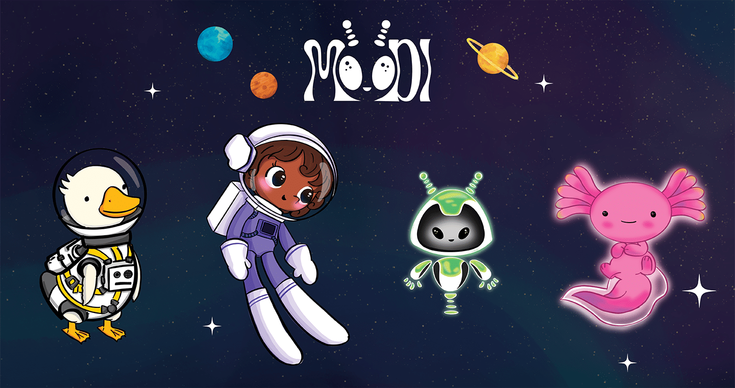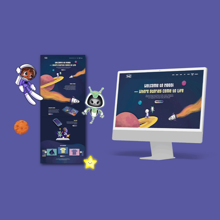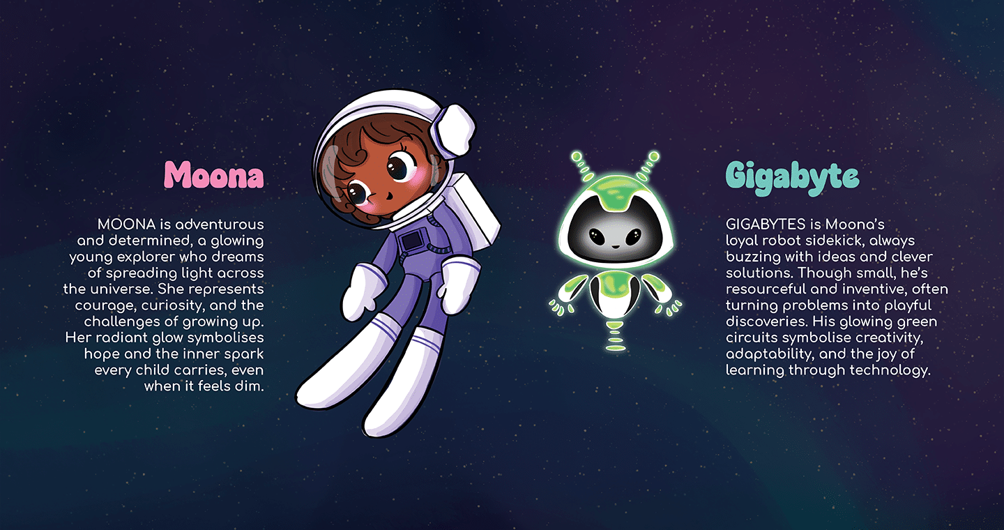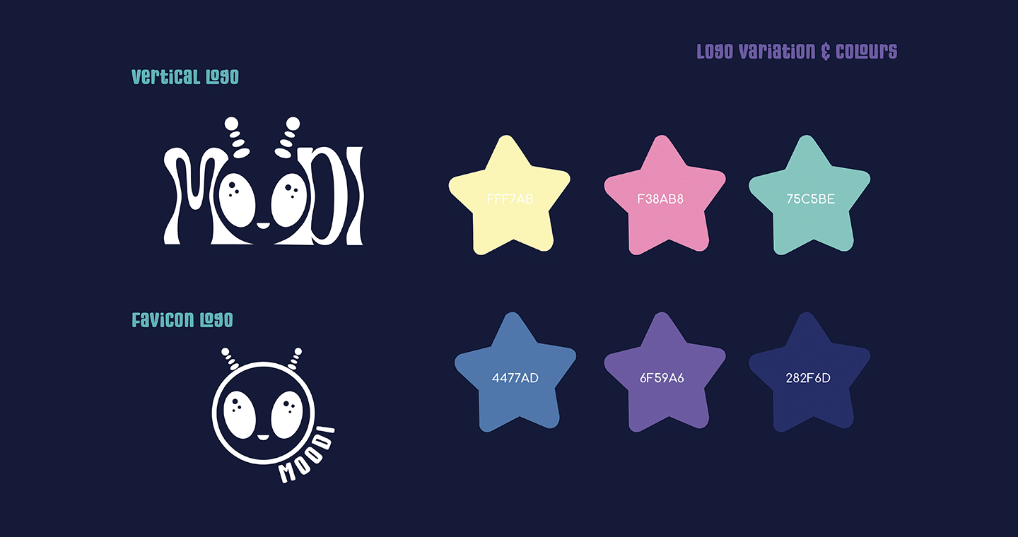 Moodi is a visual communication project combining storytelling, brand identity, and gentle interactivity. Centred on emotional learning, the story follows Moona and Gigabyte through a dreamy space adventure that encourages children to understand their feelings and embrace creativity with curiosity and care.