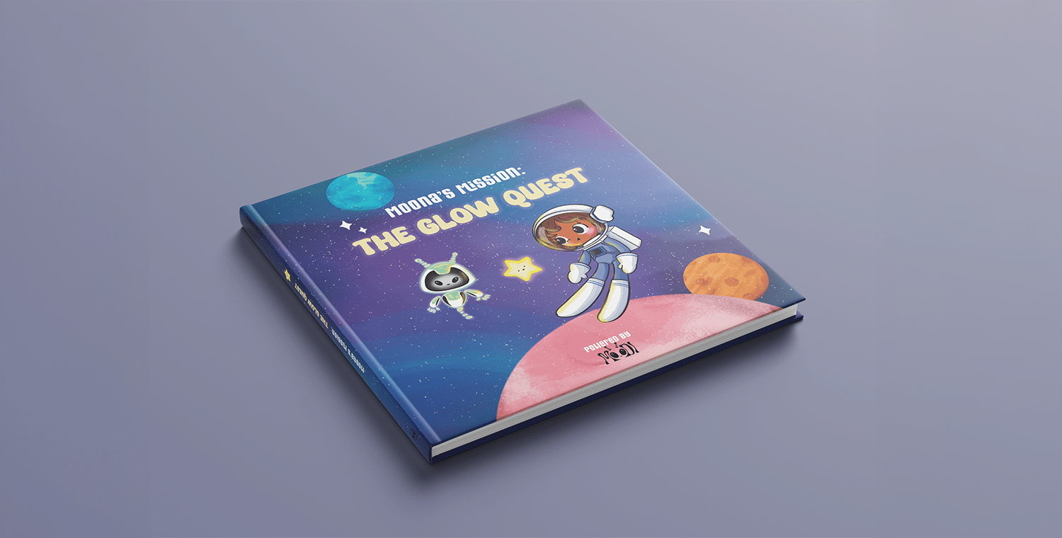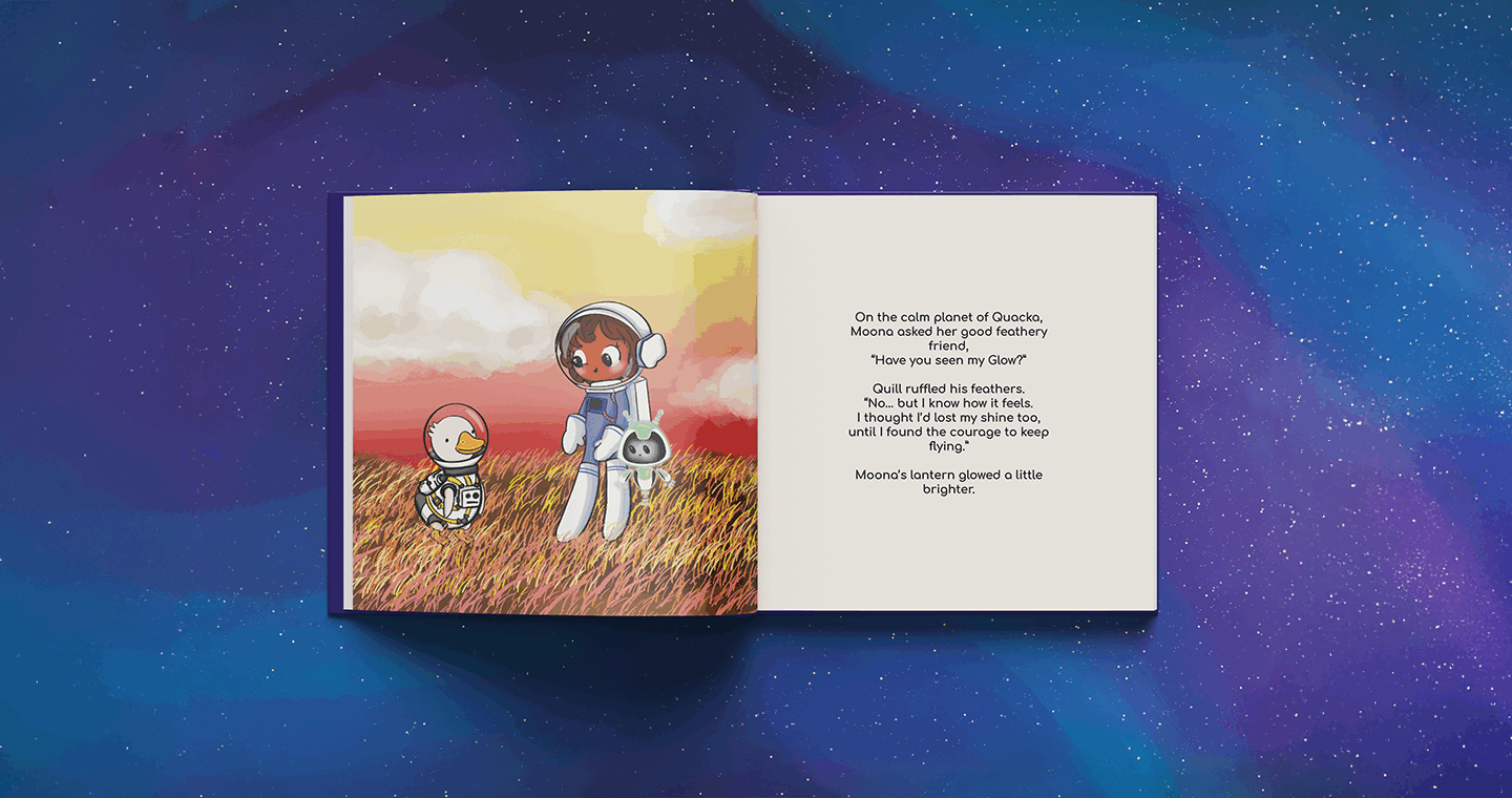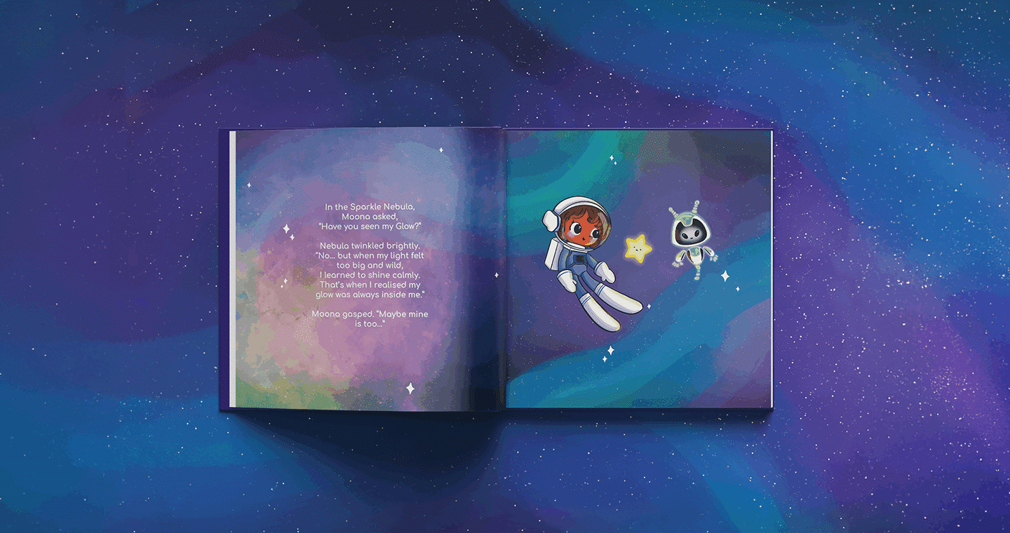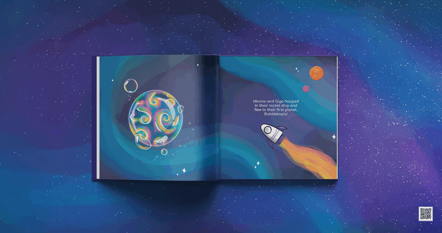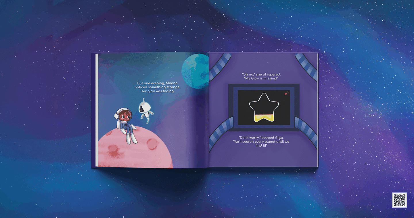 The Moodi storybook, Moona’s Mission: The Glow Quest, is the heart of the brand. Inviting children into a gentle, cosmic adventure that explores emotion, curiosity, and connection. The book features subtle AR-enhanced pages that come to life through the EyeJack app. Readers can simply download the app, scan the QR code in the bottom corner, and hover their device over the page to watch twinkling stars, bubbles, and glowing lights animate across the scene. At this stage, two pages have been developed as prototypes, demonstrating how traditional storytelling and digital play can blend seamlessly. Future iterations will expand the AR integration across all planets in Moona’s journey.