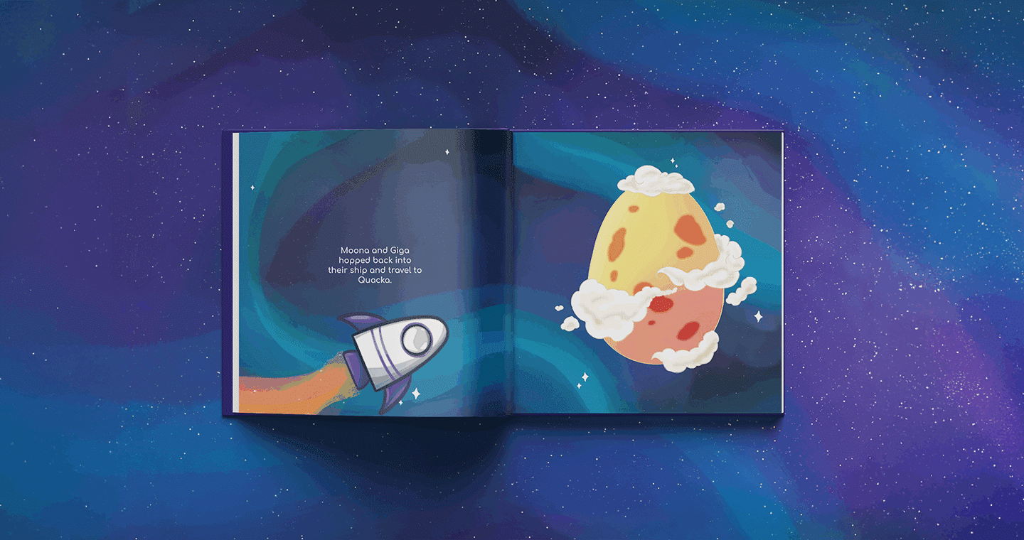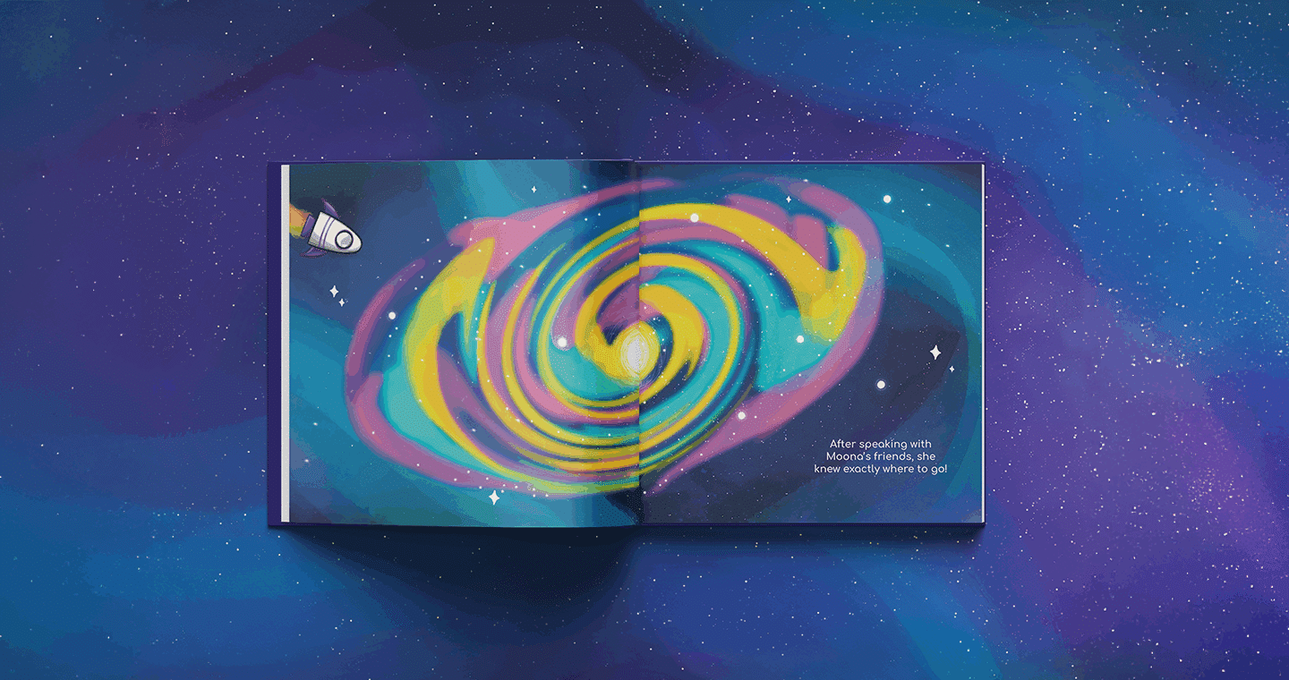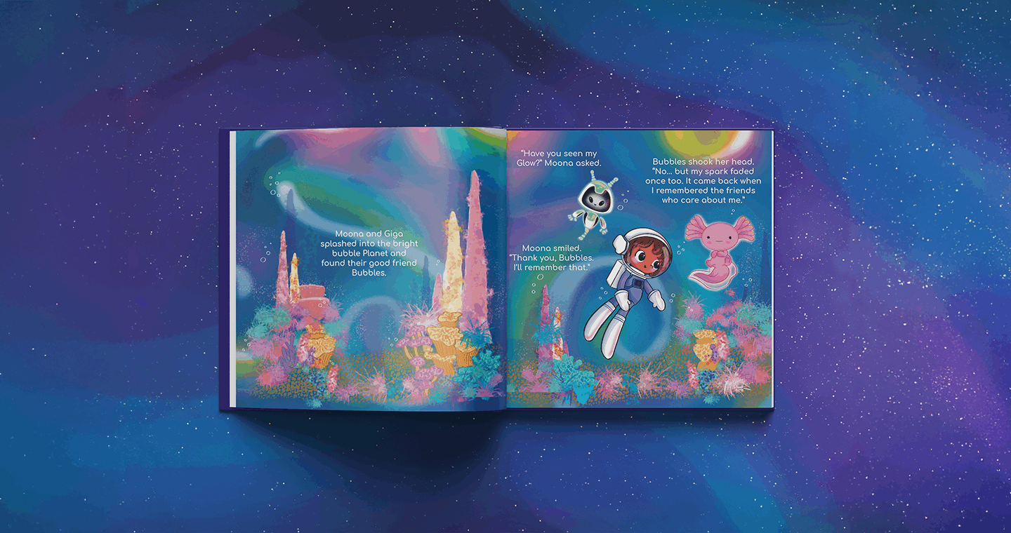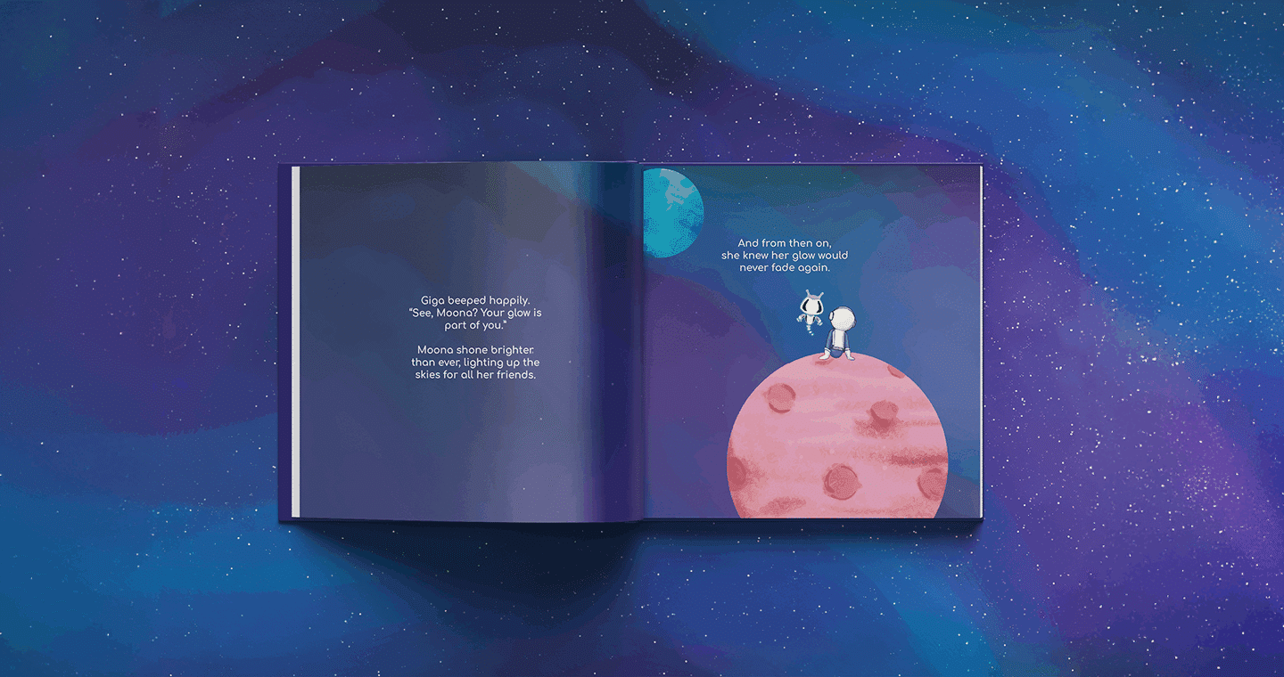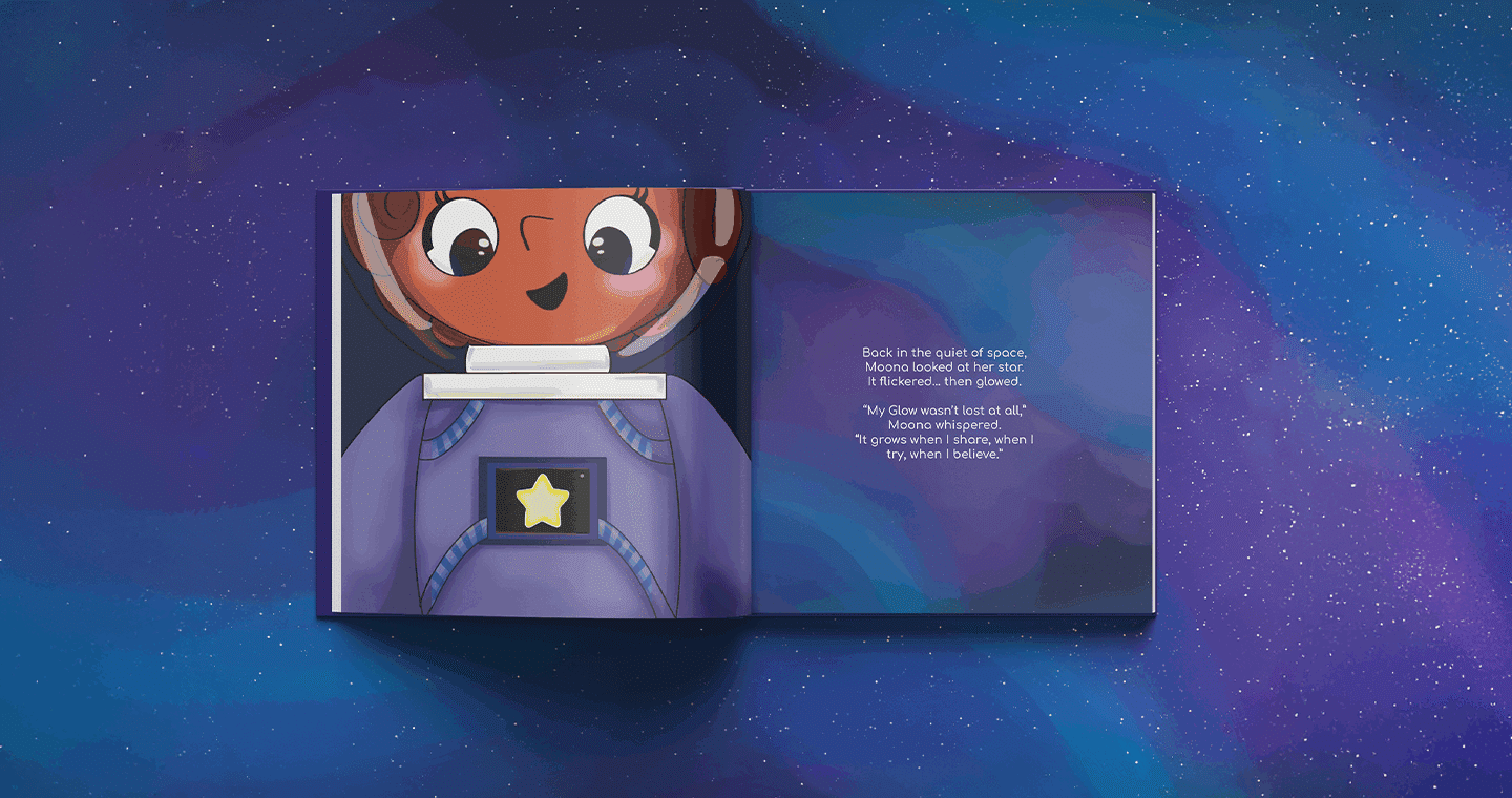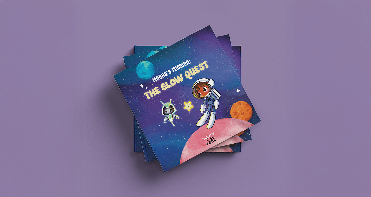 The Moodi storybook, Moona’s Mission: The Glow Quest, is the heart of the brand. Inviting children into a gentle, cosmic adventure that explores emotion, curiosity, and connection. The book features subtle AR-enhanced pages that come to life through the EyeJack app. Readers can simply download the app, scan the QR code in the bottom corner, and hover their device over the page to watch twinkling stars, bubbles, and glowing lights animate across the scene. At this stage, two pages have been developed as prototypes, demonstrating how traditional storytelling and digital play can blend seamlessly. Future iterations will expand the AR integration across all planets in Moona’s journey.