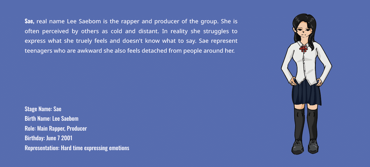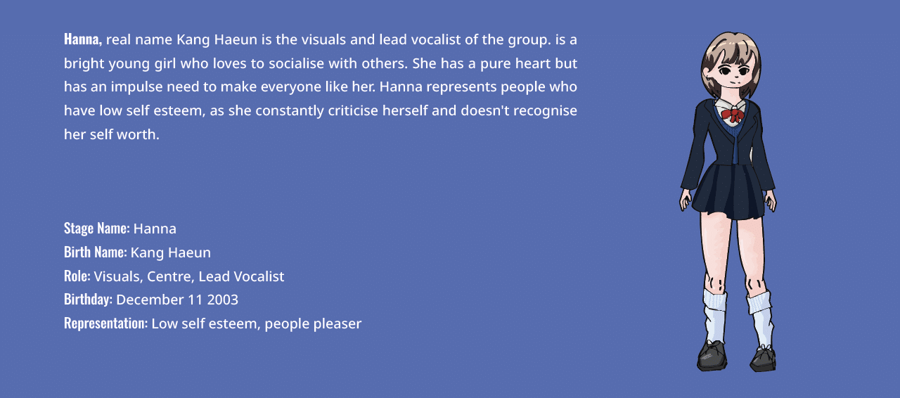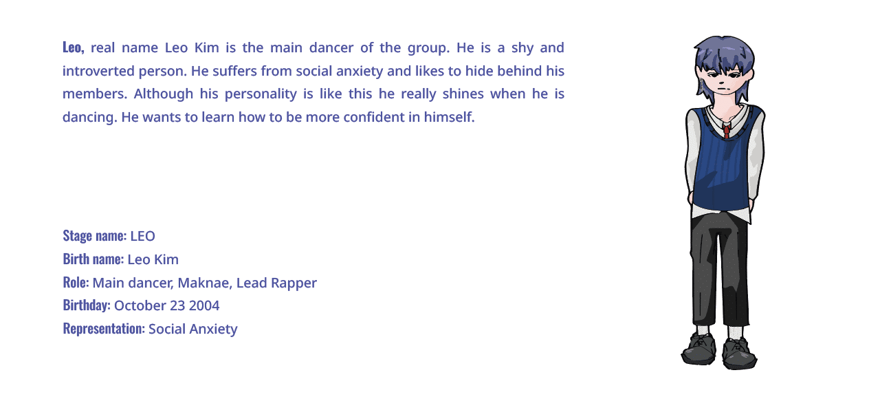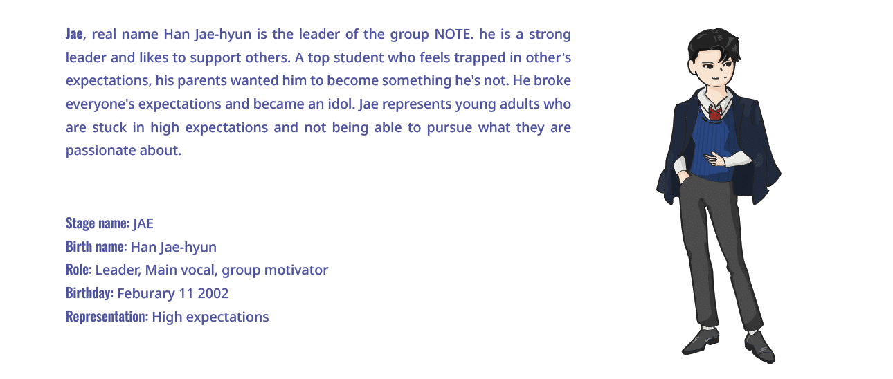 Mental health is a rising concern in young people nowadays. Though it is hard to generalise it into one form, since there are a variety of issues, such as: social anxiety, identity struggles, High academic pressure, ADHD and more. These are just some of the few examples out of the group. I wanted to create a group that educates and represents these people. To show that it’s ok to not be ok. I wanted a group that embodies teenage struggles and mental health, which is why I created the virtual Kpop group “NOTE”.