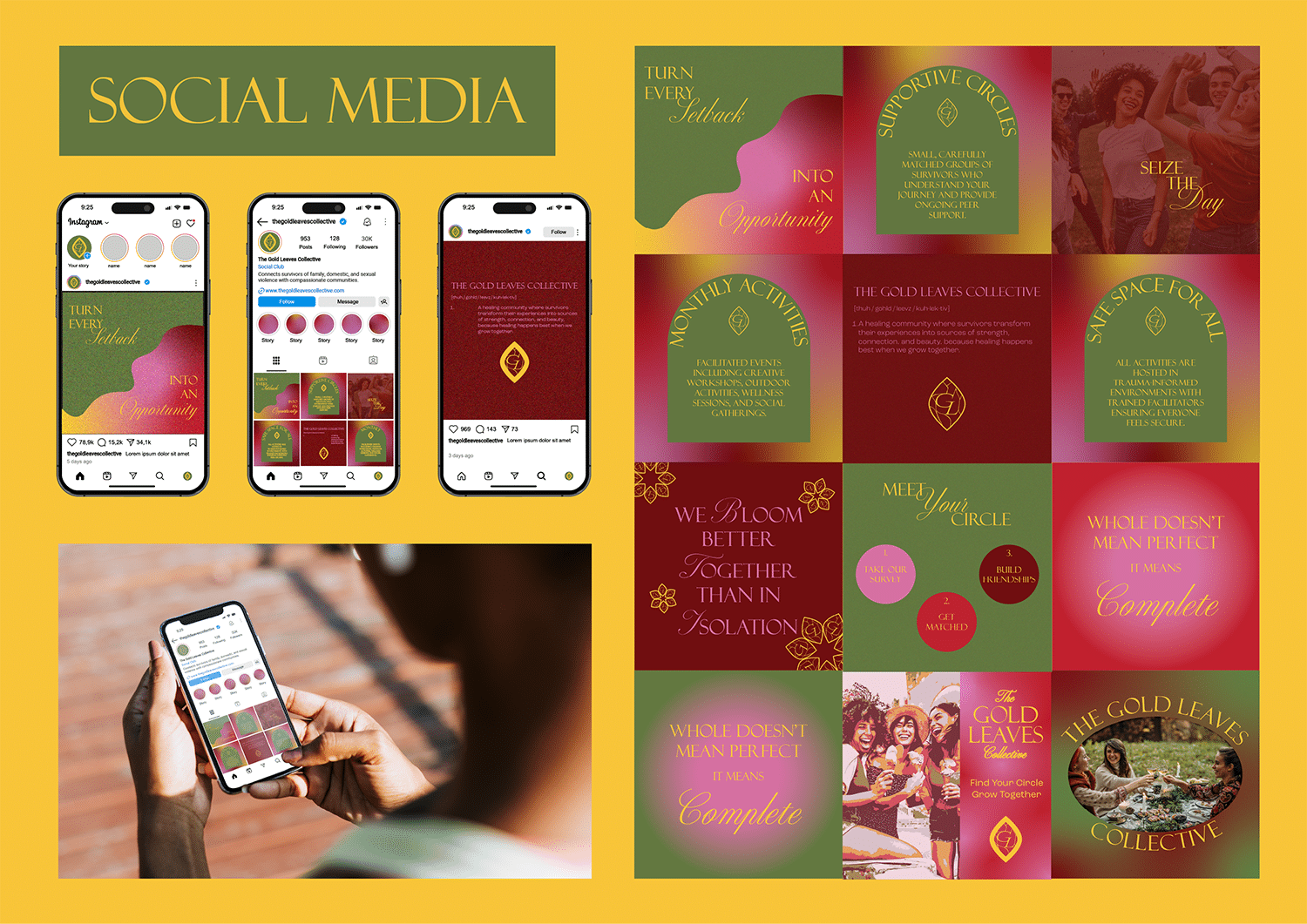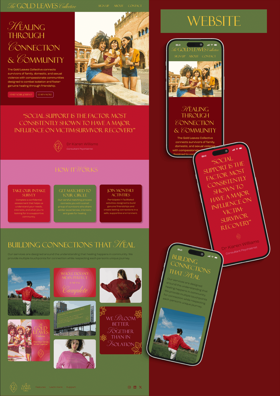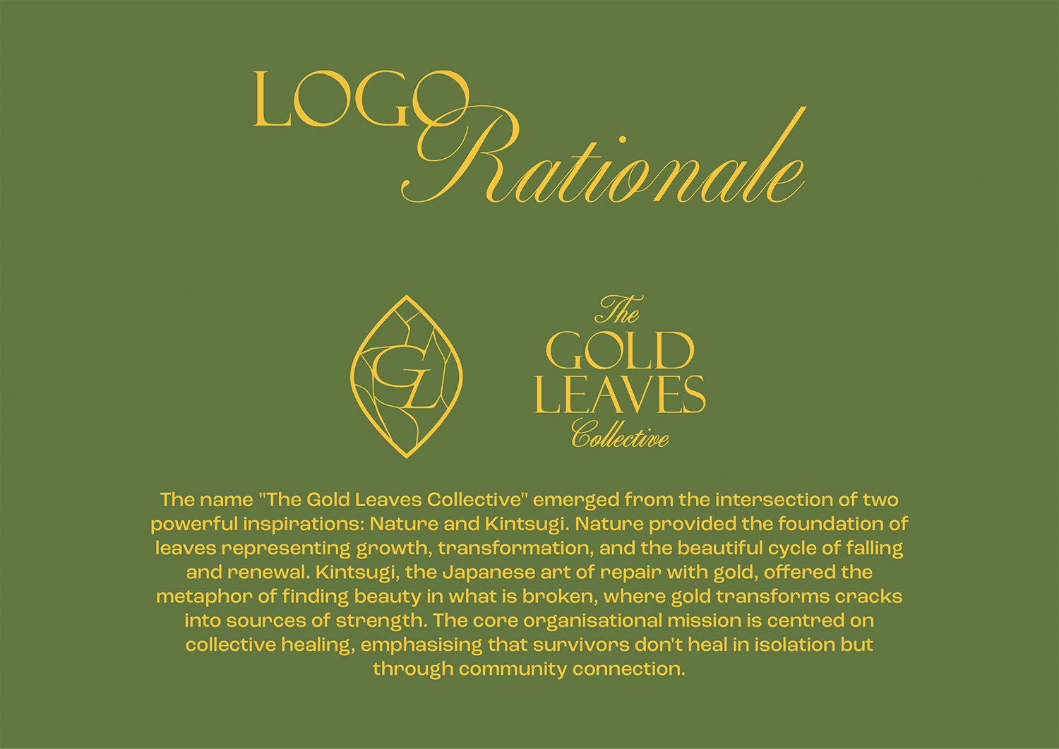 Unlike traditional support services that treat survivors during acute distress, The Gold Leaves Collective serves an underrepresented community of survivors in recovery and enables survivors who have left unsafe situations to rebuild their social bonds in safe, empowering spaces. The design rationale draws from trauma-informed principles. It prioritises safety, trust, empowerment, peer support, and cultural sensitivity. The design features offer the target audience a sense of hope and joy, with aesthetic elements inspired by social clubs, so that survivors can feel a sense of normalcy instead of the messaging that they are victims who need to be treated. These design choices were intended to minimise distress and prevent re-traumatisation. The brand identity is visually inspired by kintsugi, the Japanese art of golden repair, symbolising that healing can make people and communities stronger and more beautiful than before. The inspiration for this concept is rooted in research showing that connection and collective healing can significantly reduce isolation, anxiety, and PTSD symptoms among survivors. The Gold Leaves Collective reimagines recovery as a joyful, hopeful journey, replacing the stigma with belonging while enabling survivors to share experiences and encouragement in a trusted, collaborative environment.