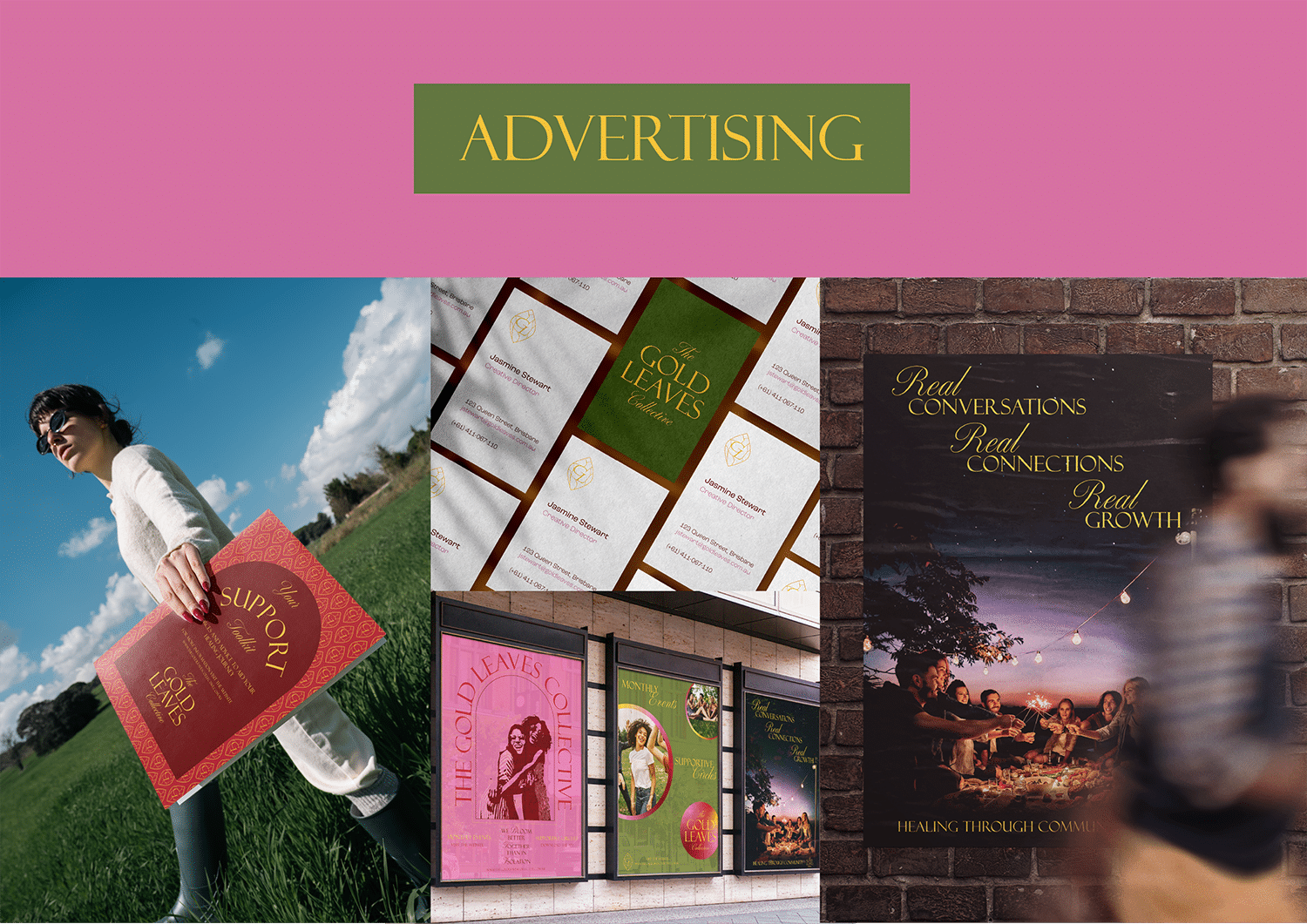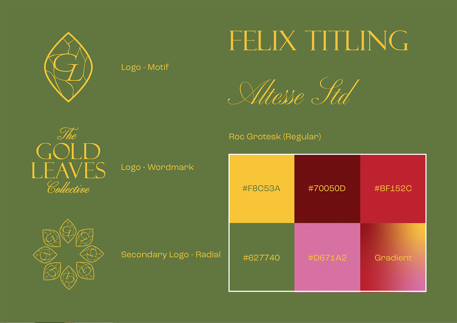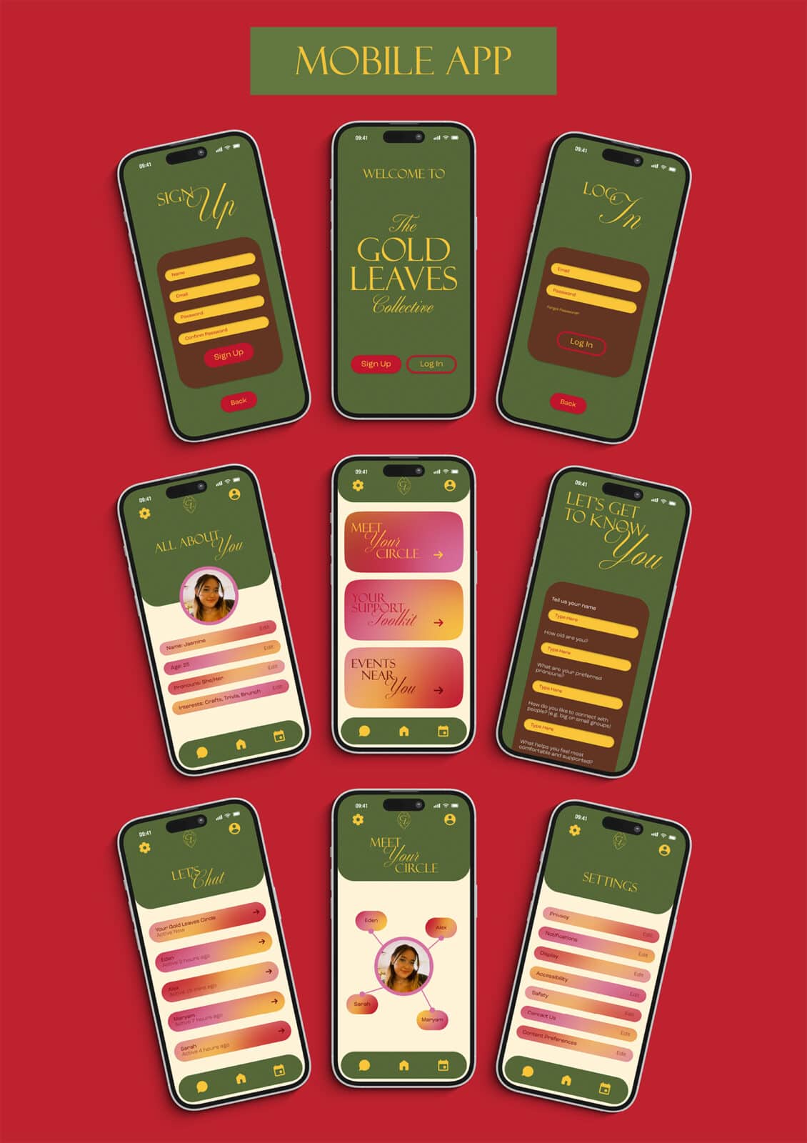 Unlike traditional support services that treat survivors during acute distress, The Gold Leaves Collective serves an underrepresented community of survivors in recovery and enables survivors who have left unsafe situations to rebuild their social bonds in safe, empowering spaces. The design rationale draws from trauma-informed principles. It prioritises safety, trust, empowerment, peer support, and cultural sensitivity. The design features offer the target audience a sense of hope and joy, with aesthetic elements inspired by social clubs, so that survivors can feel a sense of normalcy instead of the messaging that they are victims who need to be treated. These design choices were intended to minimise distress and prevent re-traumatisation. The brand identity is visually inspired by kintsugi, the Japanese art of golden repair, symbolising that healing can make people and communities stronger and more beautiful than before. The inspiration for this concept is rooted in research showing that connection and collective healing can significantly reduce isolation, anxiety, and PTSD symptoms among survivors. The Gold Leaves Collective reimagines recovery as a joyful, hopeful journey, replacing the stigma with belonging while enabling survivors to share experiences and encouragement in a trusted, collaborative environment.